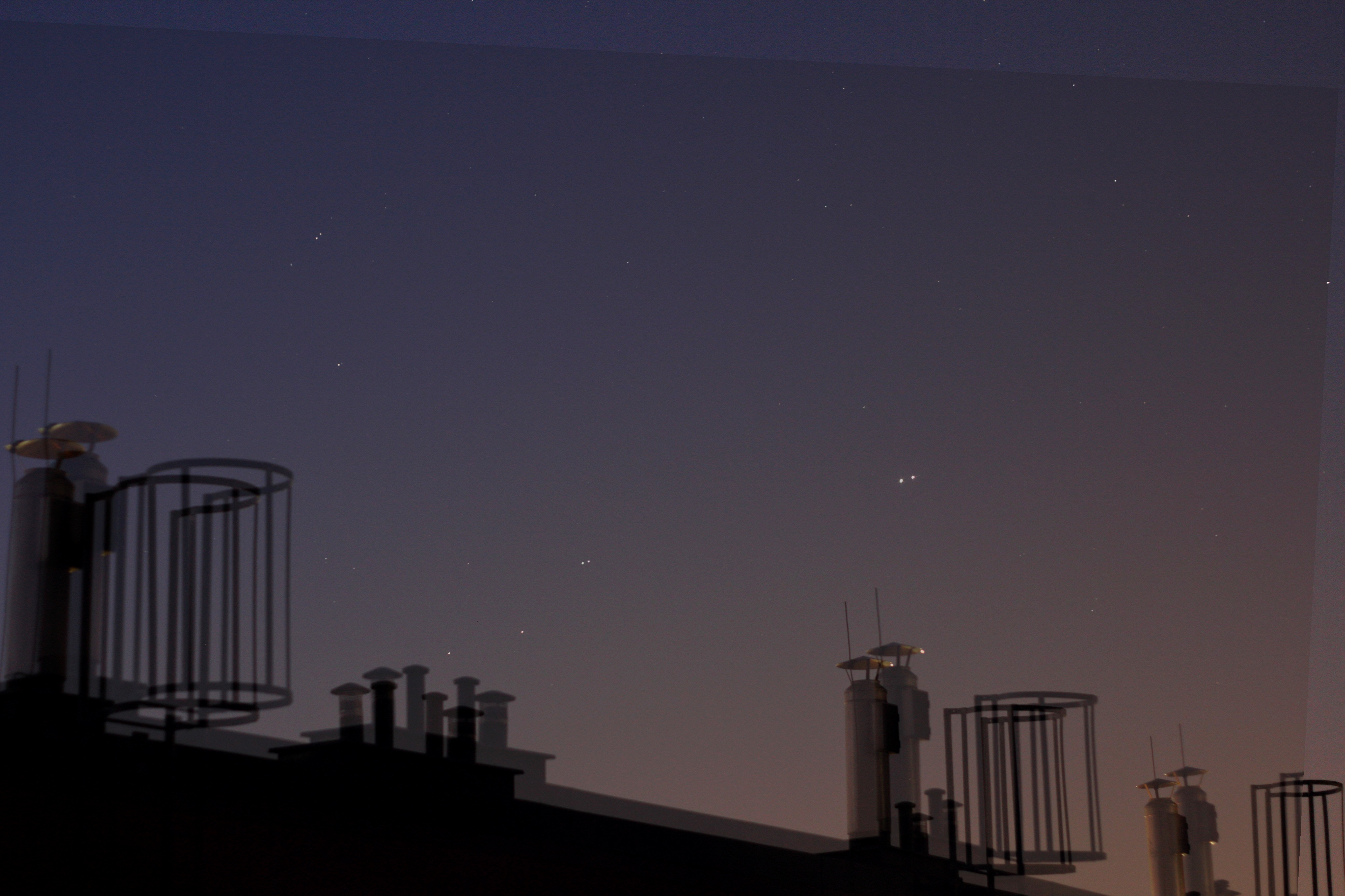 Beim Besuch der Venus bei den Pleiaden ist die schnelle Bewegung des Planeten vor dem Sternhintergrund sehr deutlich geworden. Auch bei Mars, Jupiter und Saturn ist im Abstand von zwei Tagen die Bewegung sehr auffällig. Ich habe zwei Fotos mit 50-mm-Objektiv vom 3. und 5. April auf die Sterne zentriert übereinandergelegt. Mars ist natürlich am schnellsten mit derzeit 42 Bogenminuten pro Tag. Das ist jetzt schon eine besondere Gelegenheit, alle drei hellen äusseren Planeten mit ihren unterschiedlichen Geschwindigkeiten auf einem Foto zu haben. Foto: 3. April 2020, 5:34 Uhr MESZ und 5. April 2020, 5:28 Uhr MESZ. Kamera Canon 600D, Objektiv 1:2,8, f = 50mm, 4 Sekunden belichtet.