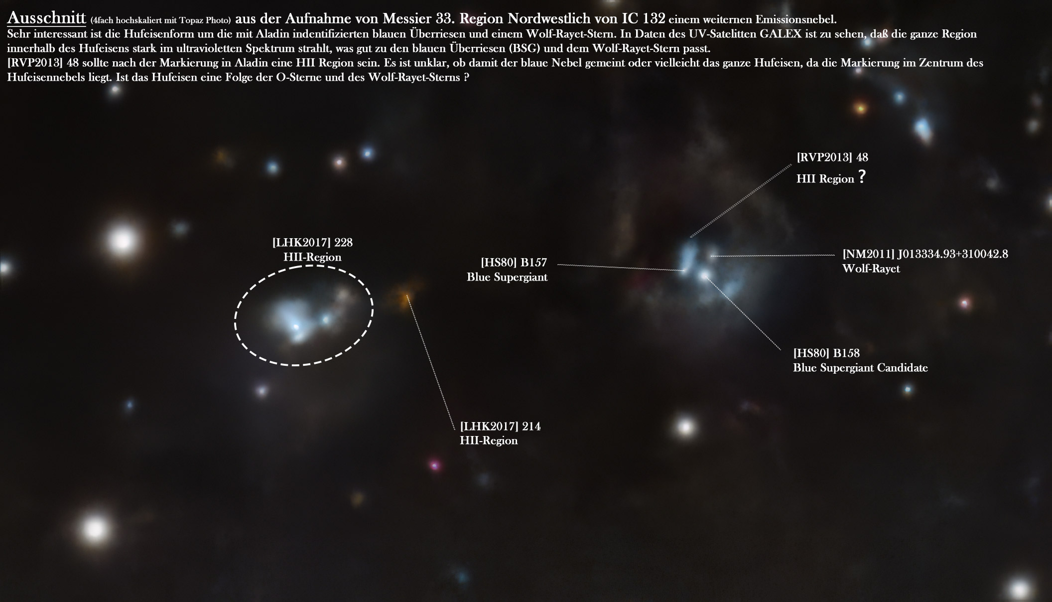 Ausschnitt (4-fach hochskaliert mit Topaz Photo) aus einer Aufnahme von Messier 33, die ich ebenfalls hochgeladen habe. Es handelt sich um eine Region etwa nordwestlich von IC 132, einem weiteren Emissionsnebel. Sehr auffallend ist die Hufeisenform um die mit Aladin indentifizierten blauen Überriesen und einem Wolf-Rayet-Stern. In Daten des UV-Satelliten GALEX ist zu sehen, dass die ganze Region innerhalb des Hufeisens stark im ultravioletten Spektrum strahlt, was gut zu den blauen Überriesen (BSG) und dem Wolf-Rayet-Stern passt.