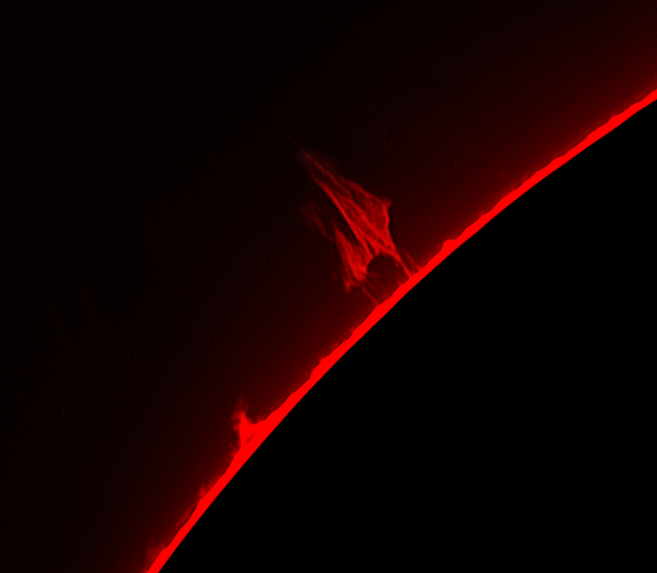 … und dann noch diese visuell sehr zarte Protuberanz. Da ich länger belichten musste, ist die Sonnenscheibe vollkommen überbelichtet. Daher habe ich sie geschwärzt.