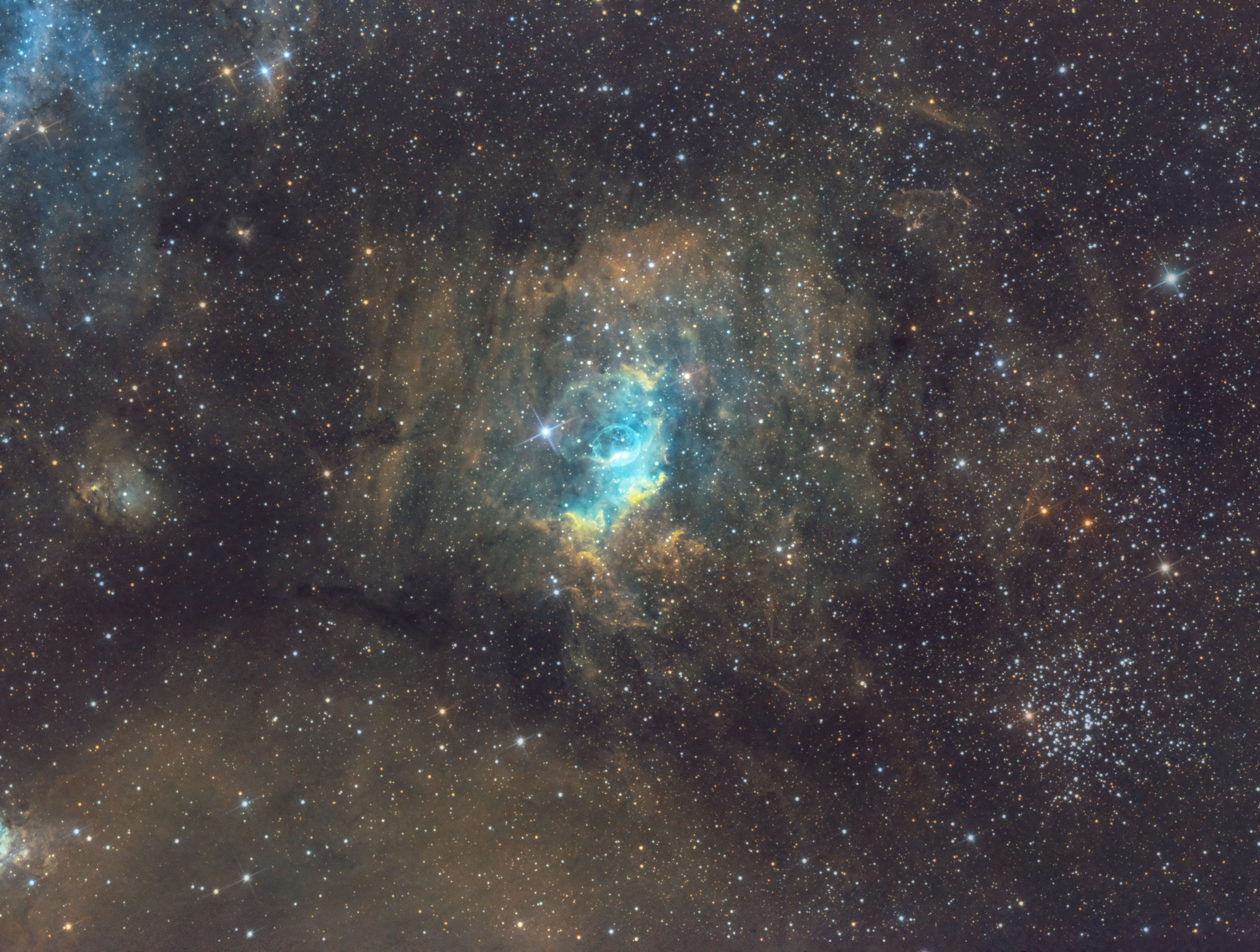 Dieses Jahr gabs so viel klare Nächte, dass man schon gar nicht mehr wusste, was man fotografieren sollte. Daher hab ich eins meiner Lieblingsobjekte vor die Linse genommen: den Blasennebel NGC 7635. Aufgenommen mit Schmalbandfiltern für Wasserstoff, Sauerstoff und Schwefel. Die Kombination in der sog. Hubblepalette wurde mit PixInsight gemacht. Die Sterne wurden separat mit RGB-Filtern aufgenommen, jeweils 20 min pro Farbe und anschließend ausgetauscht.