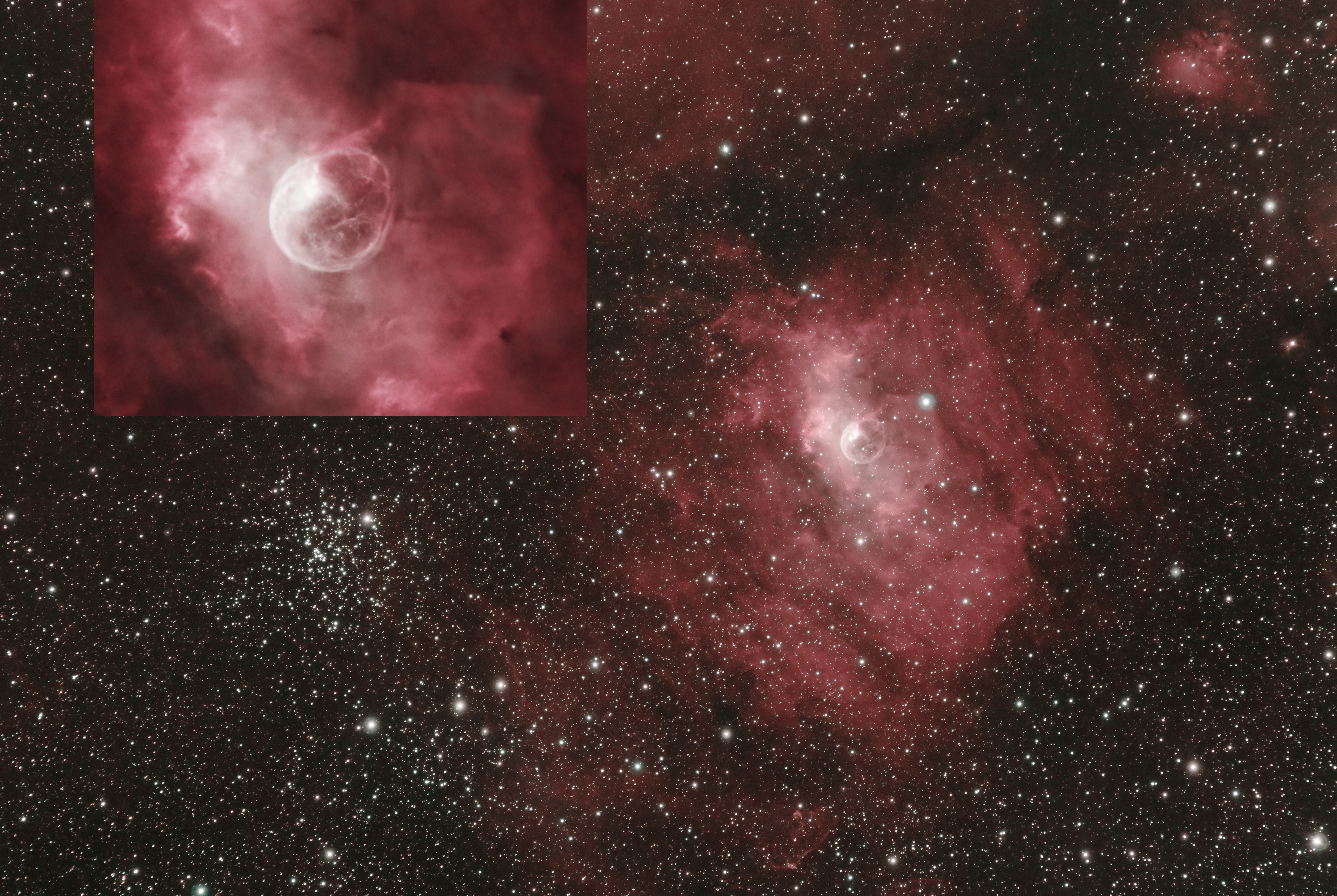 Neben dem offenen Sternhaufen M52 erschliesst sich die innere Struktur des Blasennebels erst in längerbelichteten Aufnahmen. Besonders deutlich wird die Struktur der Stossfront nach Entfernung der Sterne aus dem Bild...