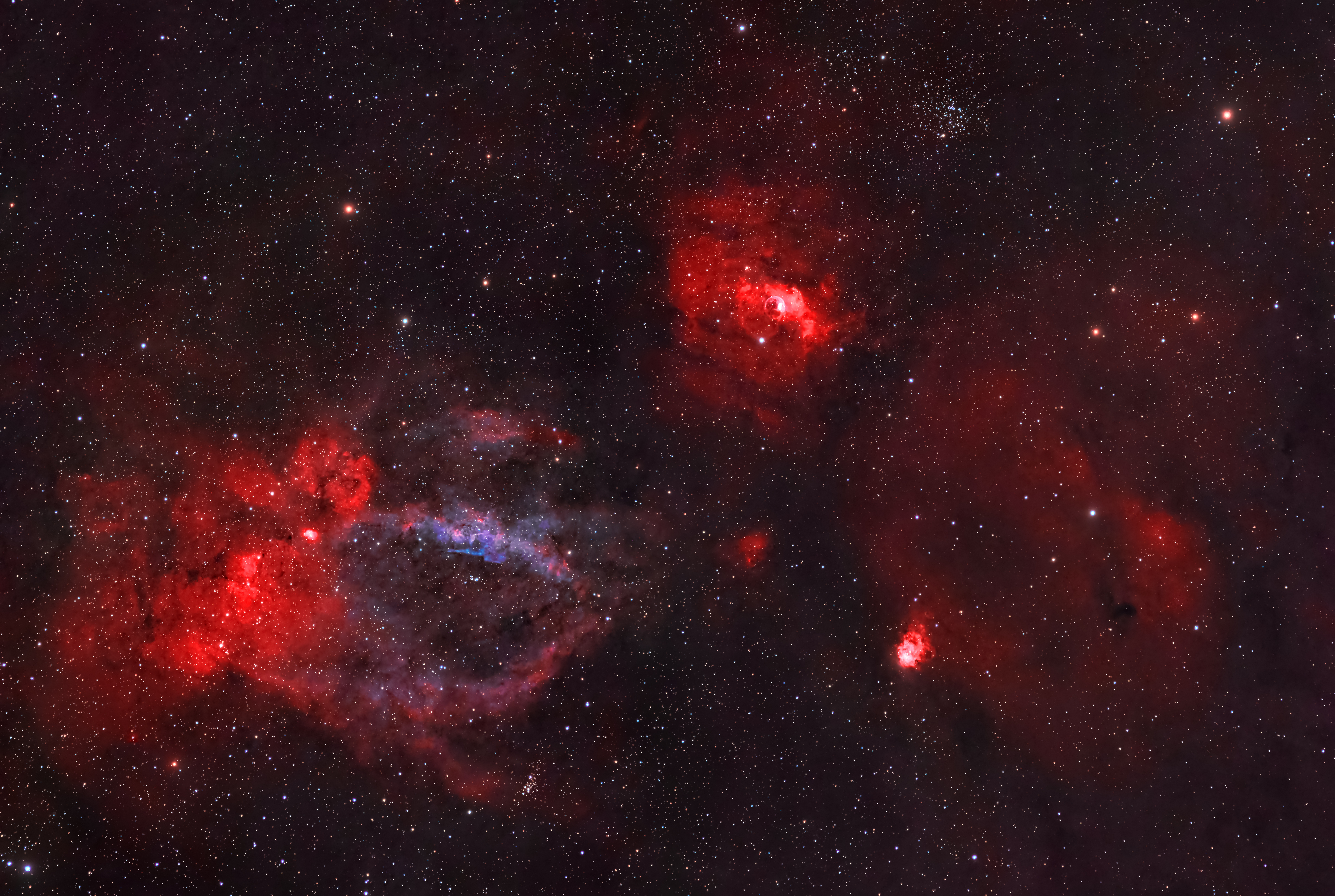 Dies ist ein Mosaik aus zwei Bildern, das die reichhaltige Gegend um den berühmten Blasennebel (NGC 7635 oder Sh2-162) zwischen den Sternbildern Kepheus und Kassiopeia zeigt. Neben Sh2-162 (oben in der Mitte) sind die Hauptmotive des Bildes der Hummerscherennebel (Sh2-157, unten links), Sh2-159 (Mitte) und Sh2-161 (das riesige HII-Gebiet rechts), NGC 7538 (der hellste Nebel unten rechts) und die Sternhaufen NGC 7510 (unten, unter der Schere) und M52 (oben, rechts von der Blase).