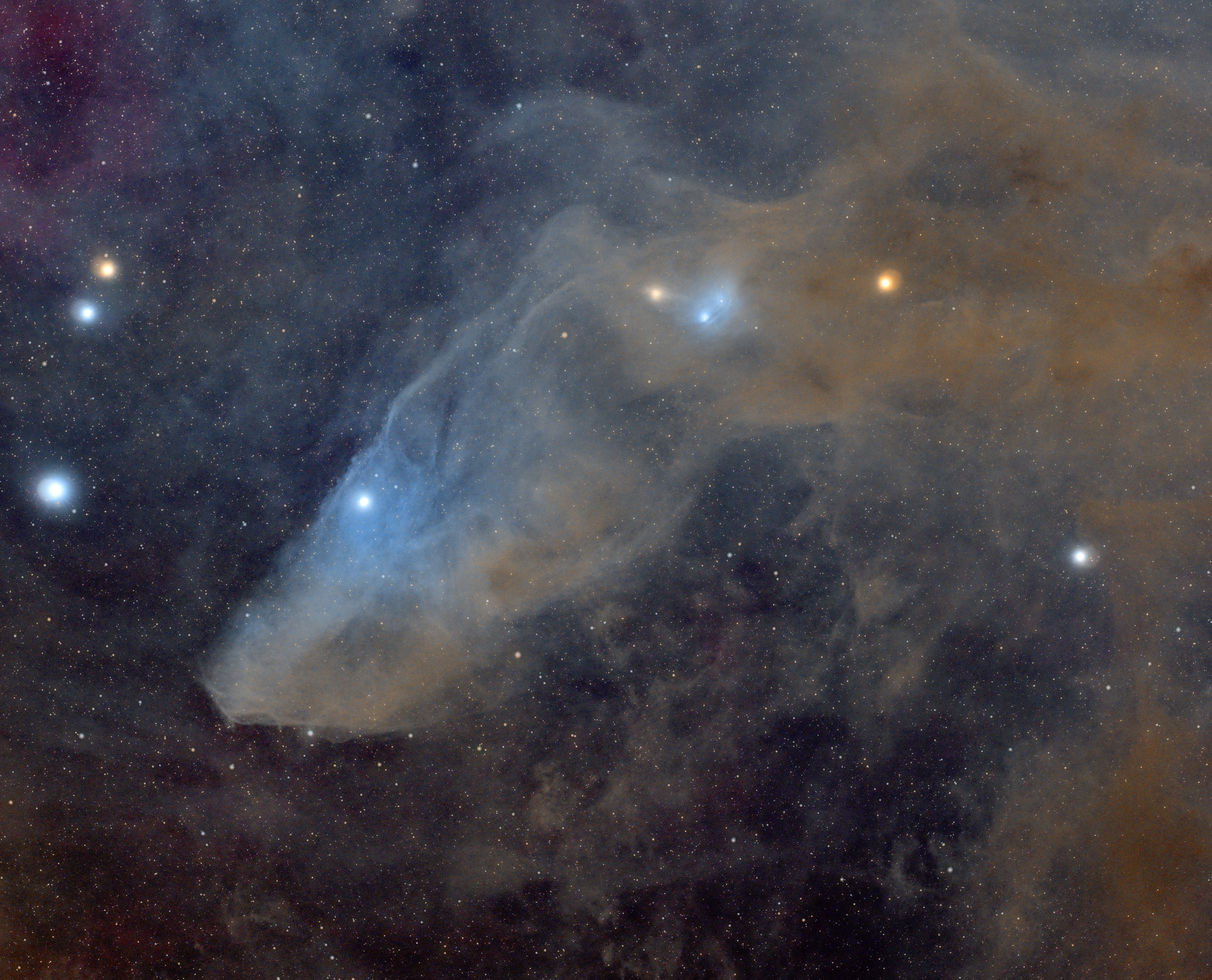 IC 4592 ist ein ausgedehnter Reflexionsnebel im Sternbild Skorpion, auch bekannt unter der Bezeichnung Blue Horse Head Nebula. Es handelt sich um einen Molekülwolkenkomplex eingebettet in Staub und beleuchtet von dem Stern im Auge des Kopfes. Rechts noch der Reflexionsnebel IC 4601 mit zwei eingebetteten Doppelsternen, sehr diffus wegen des umgebenden Staubs. Den RedCat 51 hatte ich mir im letzten Moment noch besorgt und im Rucksack nach Namibia mitgenommen.