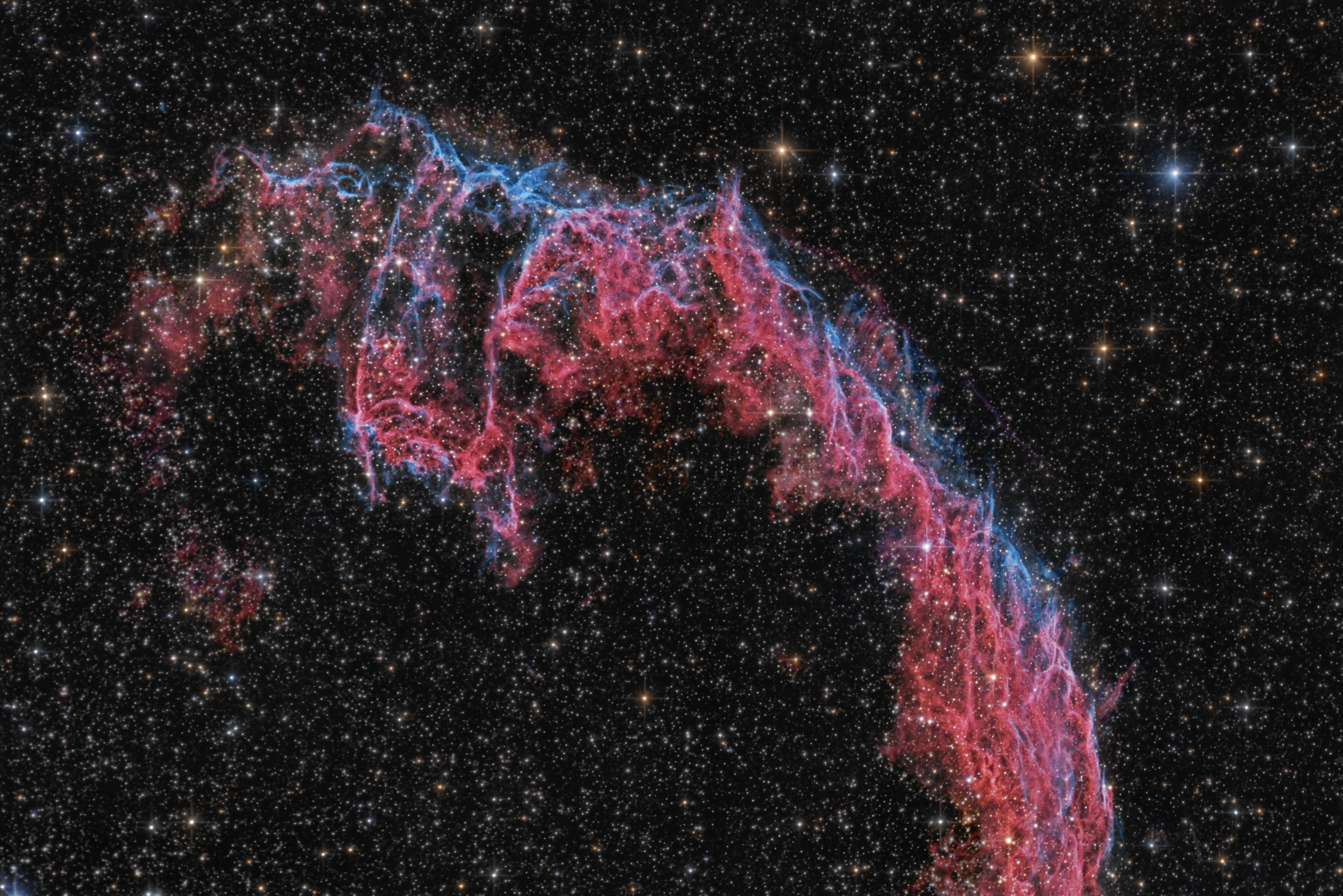 NGC 6995 ist Teil des Cirrusnebels. Dieser ist Überrest einer Supanovaexplosion in einer Entfernung von zirka 1500 Lichtjahren, die sich vor zirka 8000 Jahren ereignete. Heute zieren schöne Filamente dieses Objekt, die ich hier herausholen wollte.