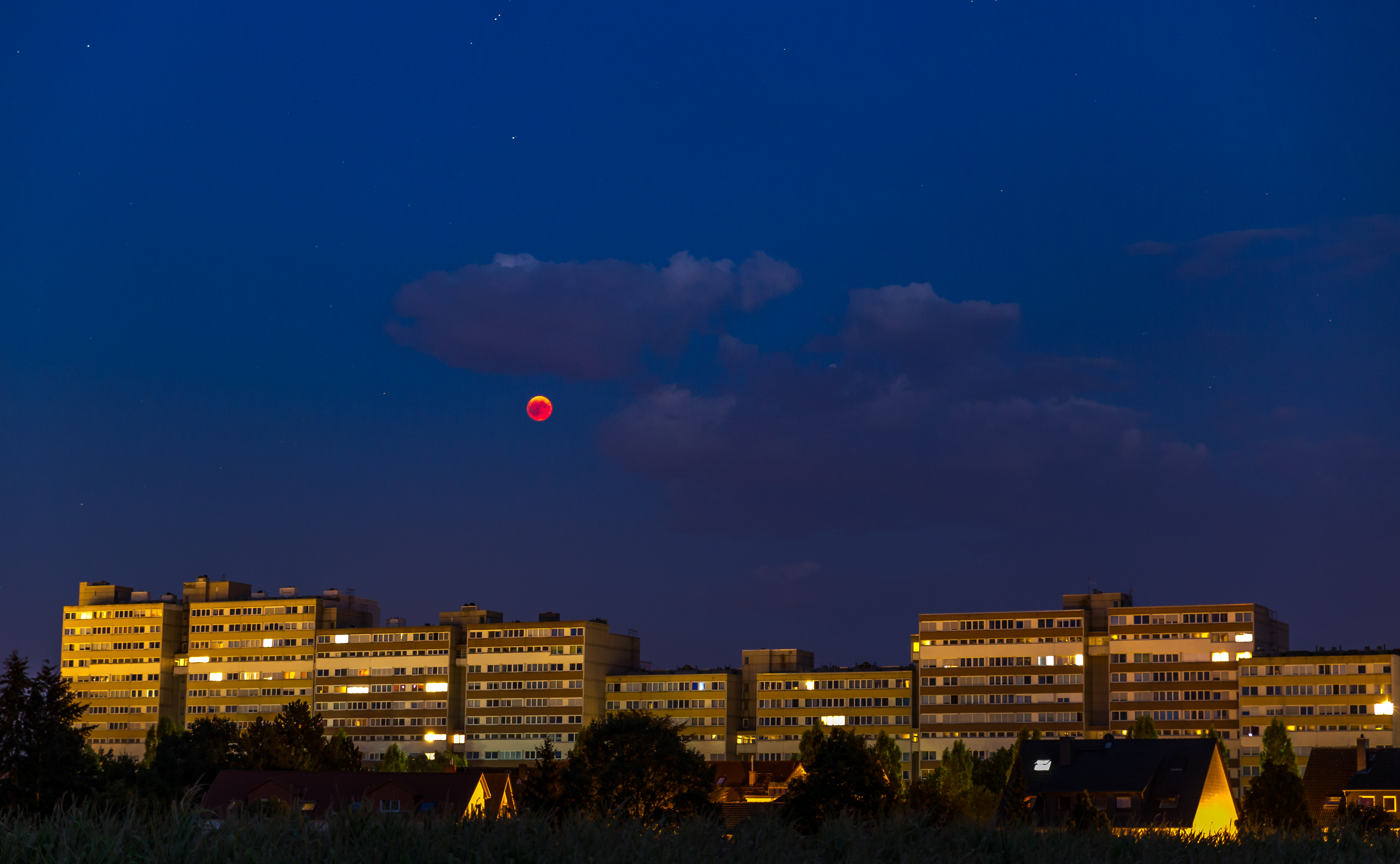Die Aufnahme zeigt die Mondfinsternis vom 27. Juli 2018 über der "chinesischen Mauer" von Rodgau zur blauen Stunde.