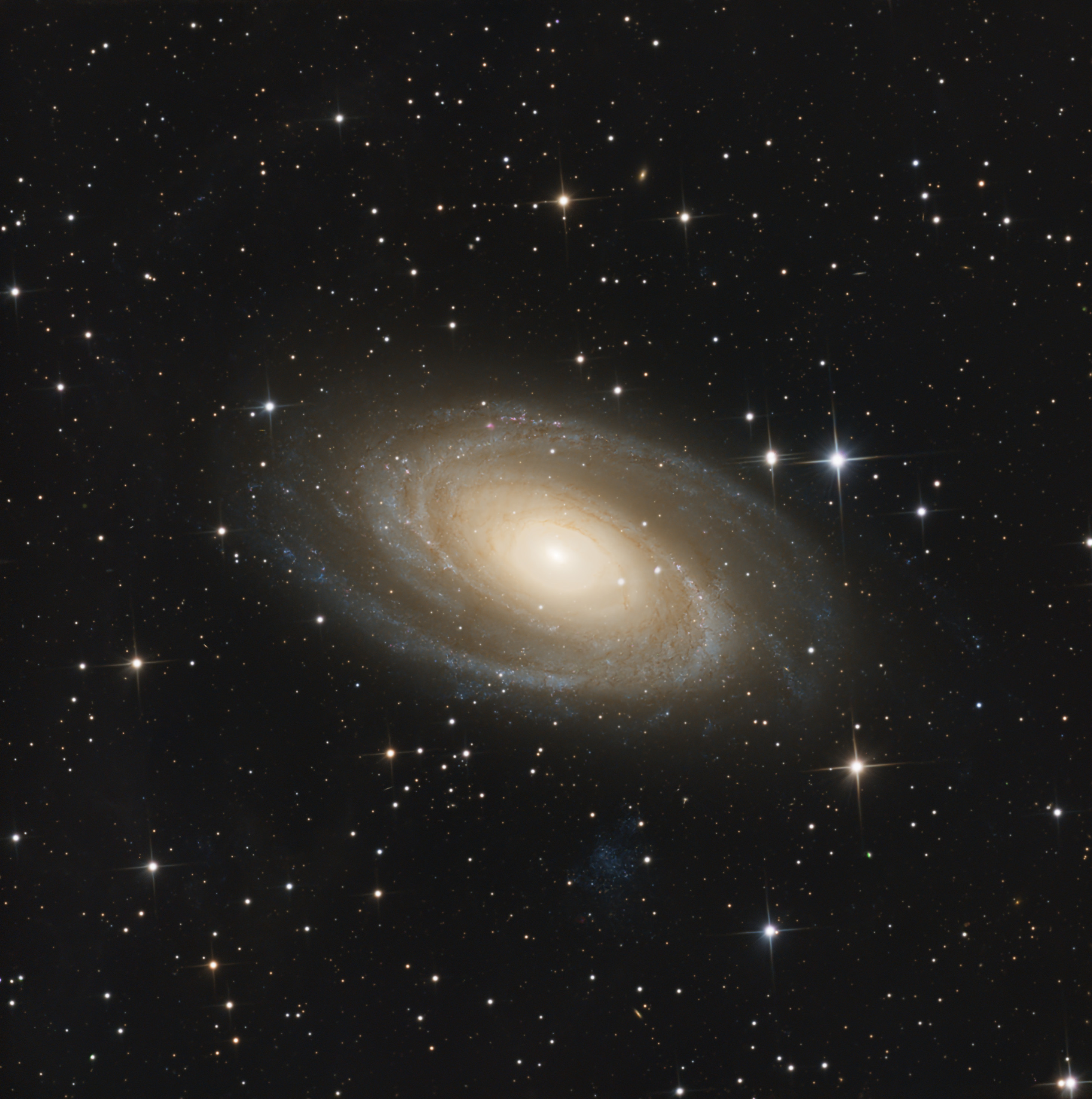 Messier 81 (Bodes Galaxie) ist eine etwa 12 Millionen Lichtjahre entfernte Spiralgalaxie im Sternbild Großer Bär und Mitglied der M81-Galaxiengruppe. Neben dem hellen zentralen Bulge und den fein strukturierten Spiralarmen ist im unteren Bildbereich auch die bläulich leuchtende Zwerggalaxie Holmberg IX zu erkennen, die gravitativ an M 81 gebunden ist und aktive Sternentstehung zeigt. Darüber hinaus sind im Hintergrund zahlreiche ferne Galaxien sichtbar, deren Licht aus Entfernungen von vielen hunderten Millionen bis Milliarden Lichtjahren stammt.