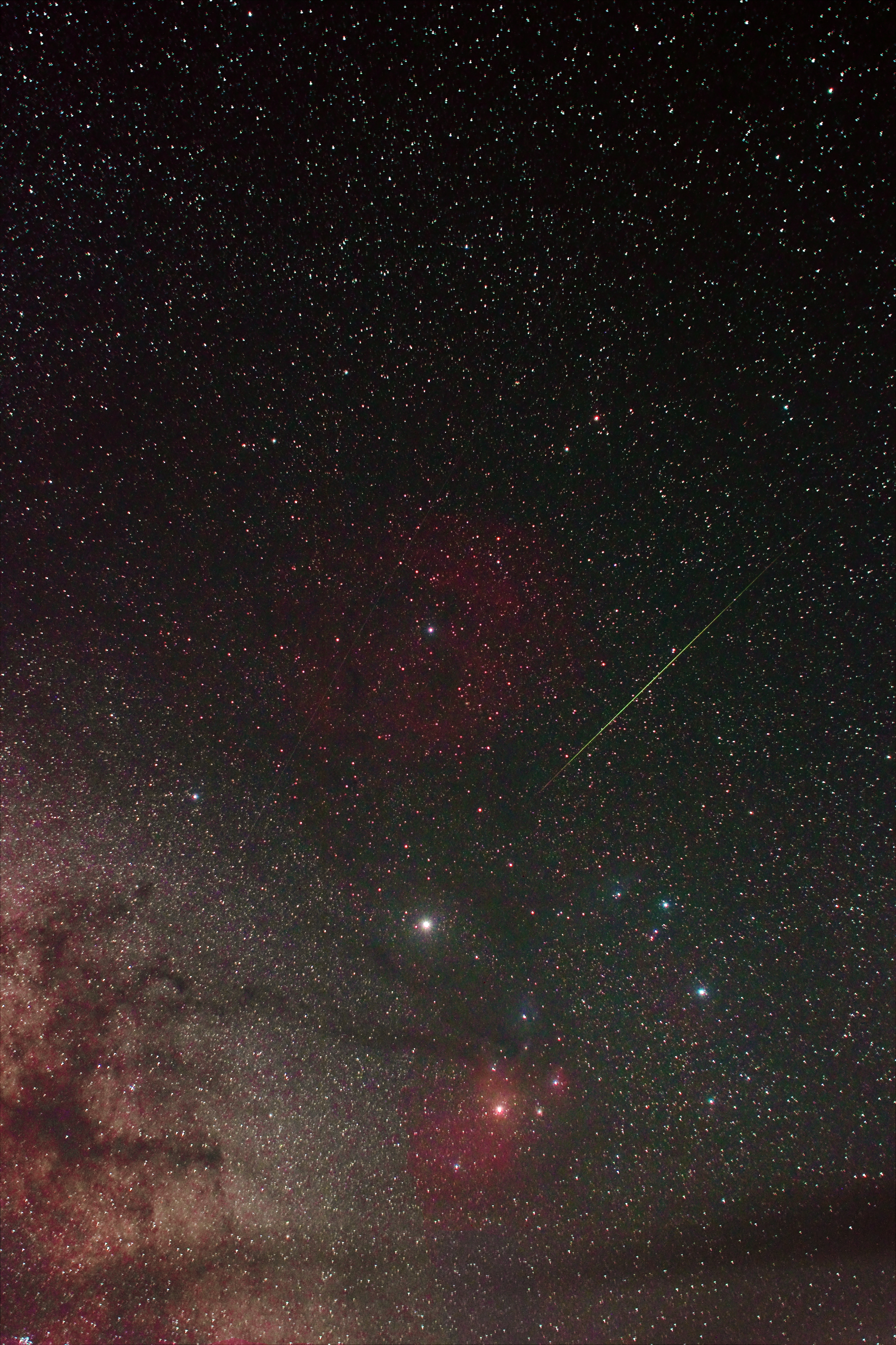 Während der Belichtung der Milchstraße im Skorpion und Schlangenträger mit ihren großflächigen galaktischen Nebeln um Antares und Zeta Oph kreuzte eine ca. venushelle Feuerkugel das Aufnahmefeld.