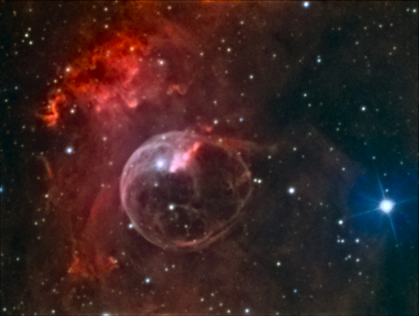 Unbändige Sternwinde eines massiven Wolf-Rayet Sterns treffen auf eine unbewegliche Molekülwolke, formen dabei eine Blase im Weltraum. Getroffen von der intensiven UV-Strahlung, leuchtet ein nahes Segment der Molekülwolke besonders hell auf. Material, welches der Stern am Äquator unterhalb Fluchtgeschwindigkeit auswirft, regnet an den Polen zurück, bildet ein Netzwerk aus Filamenten, nächste Haltestelle: Supernova.