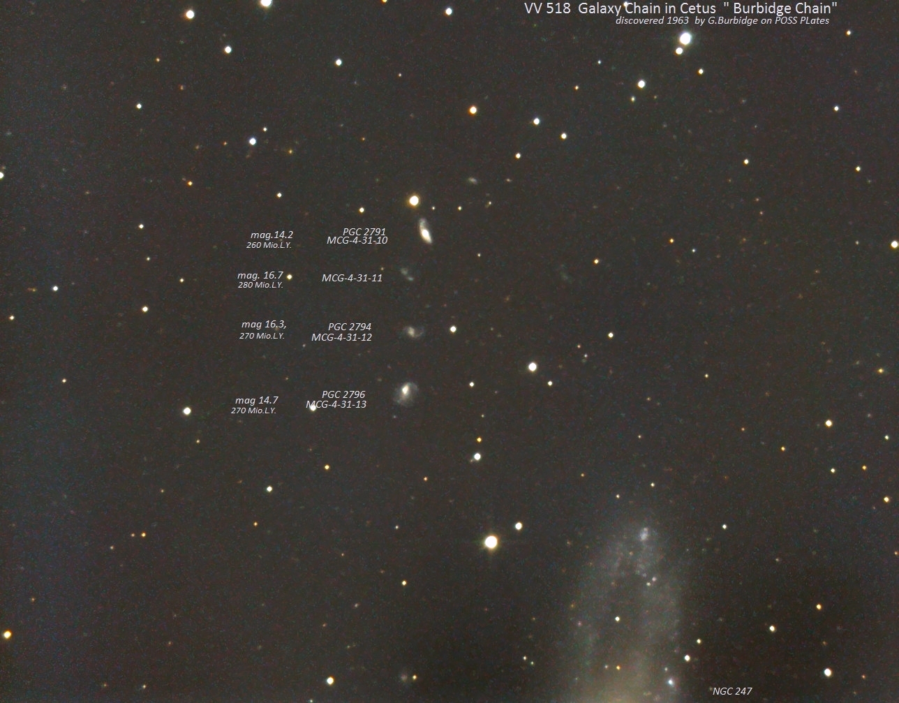 Nur 10 Bogenminuten nordöstlich der schönen Galaxie NGC 247 liegt diese Kette von vier strukturierten Galaxien (Ausdehnung 6 Bogenminuten, zwischen 14,5 und 16 mag, Deklination -20,5 Grad) in einer Entfernung von 270 Millionen Lichtjahren.