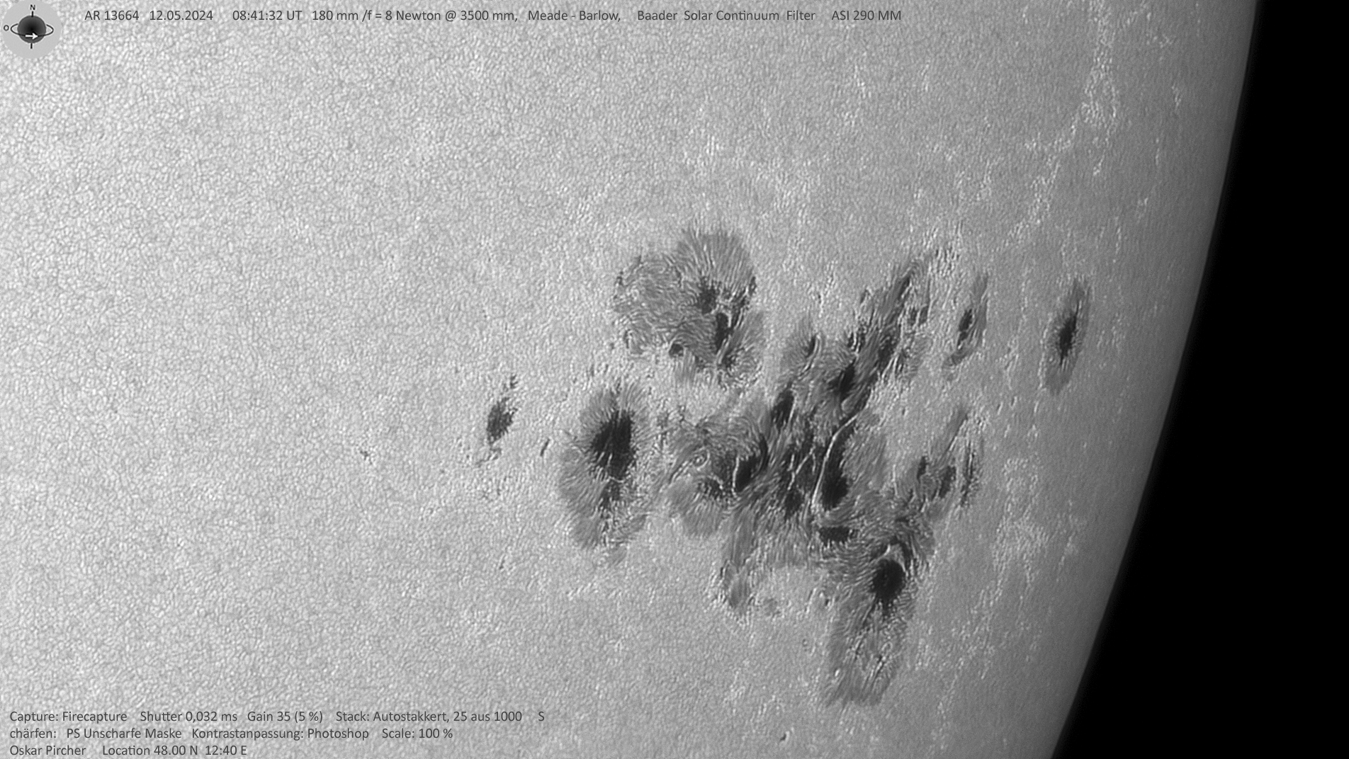 | Teleskop/Objektiv | 180 mm Newton, Baader Solar Continuum Filter |