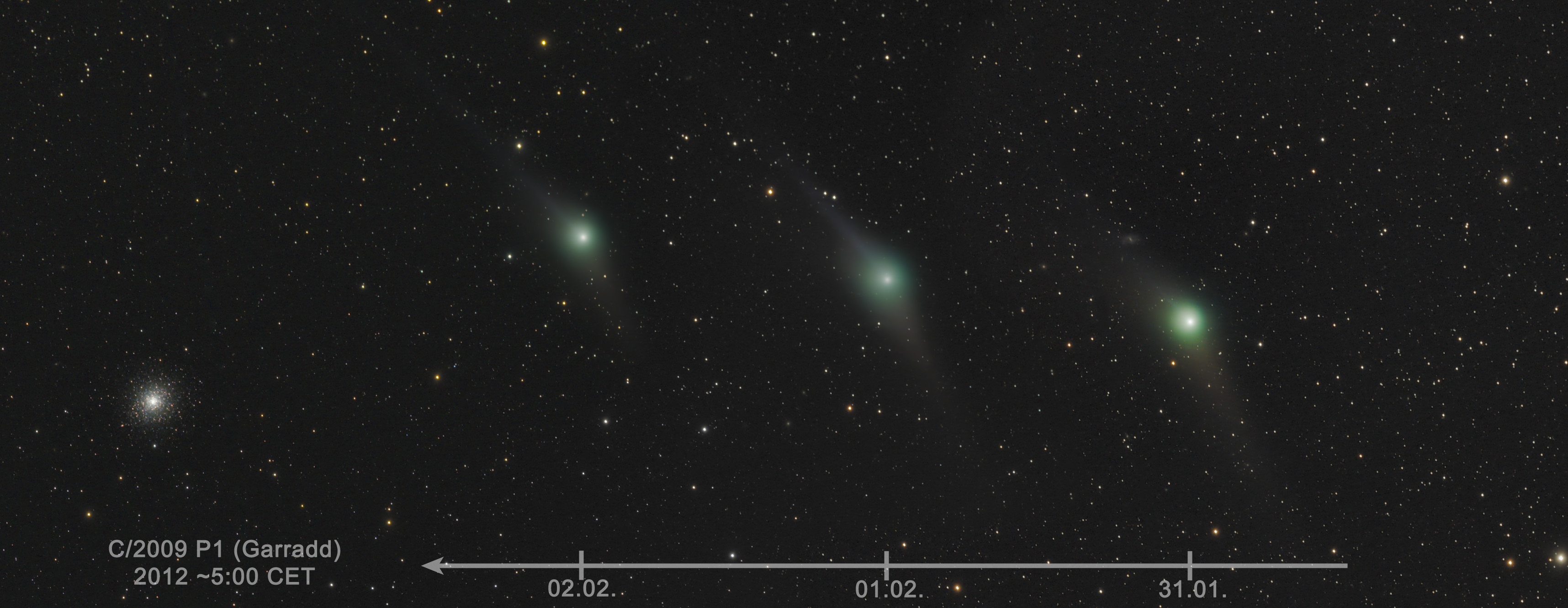 In den Nächten vom 31.1.2012 - 2.2.2012 konnte ich die Annäherung Garradds an M 92 dokumentieren. Alle drei Bilder wurden am Aufnahmetag bearbeitet und zeigen daher Unterschiede bei der Bearbeitung. Das Mosaik wurde einfach mit Photoshop erstellt und zurecht geschnitten.