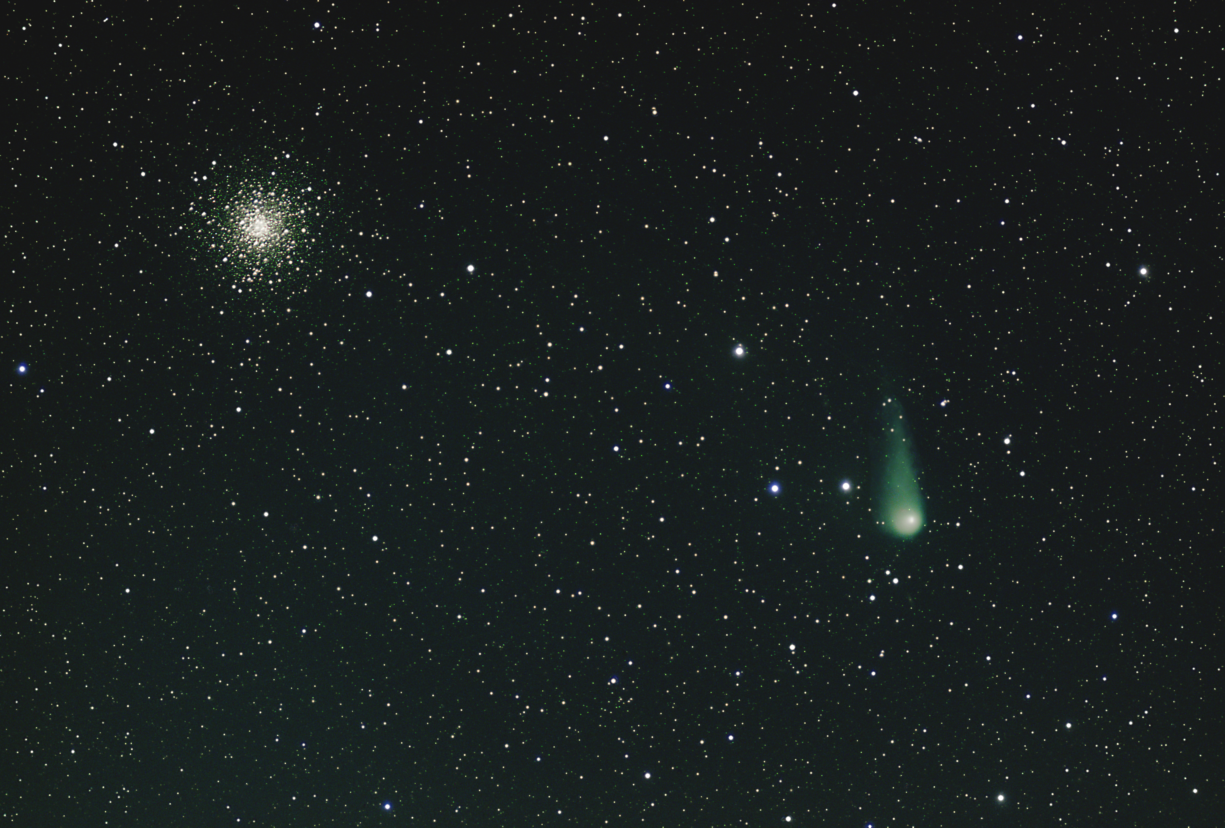 Nachdem es in der Nacht der stärksten scheinbaren Annäherung des Kometen an M 10 bei uns in Norddeutschland leider bewölkt war, klarte es dann in der folgenden Nacht vom 16. zum 17. Juli auf, sodass noch beide Objekte in einem Foto festgehalten werden konnten.