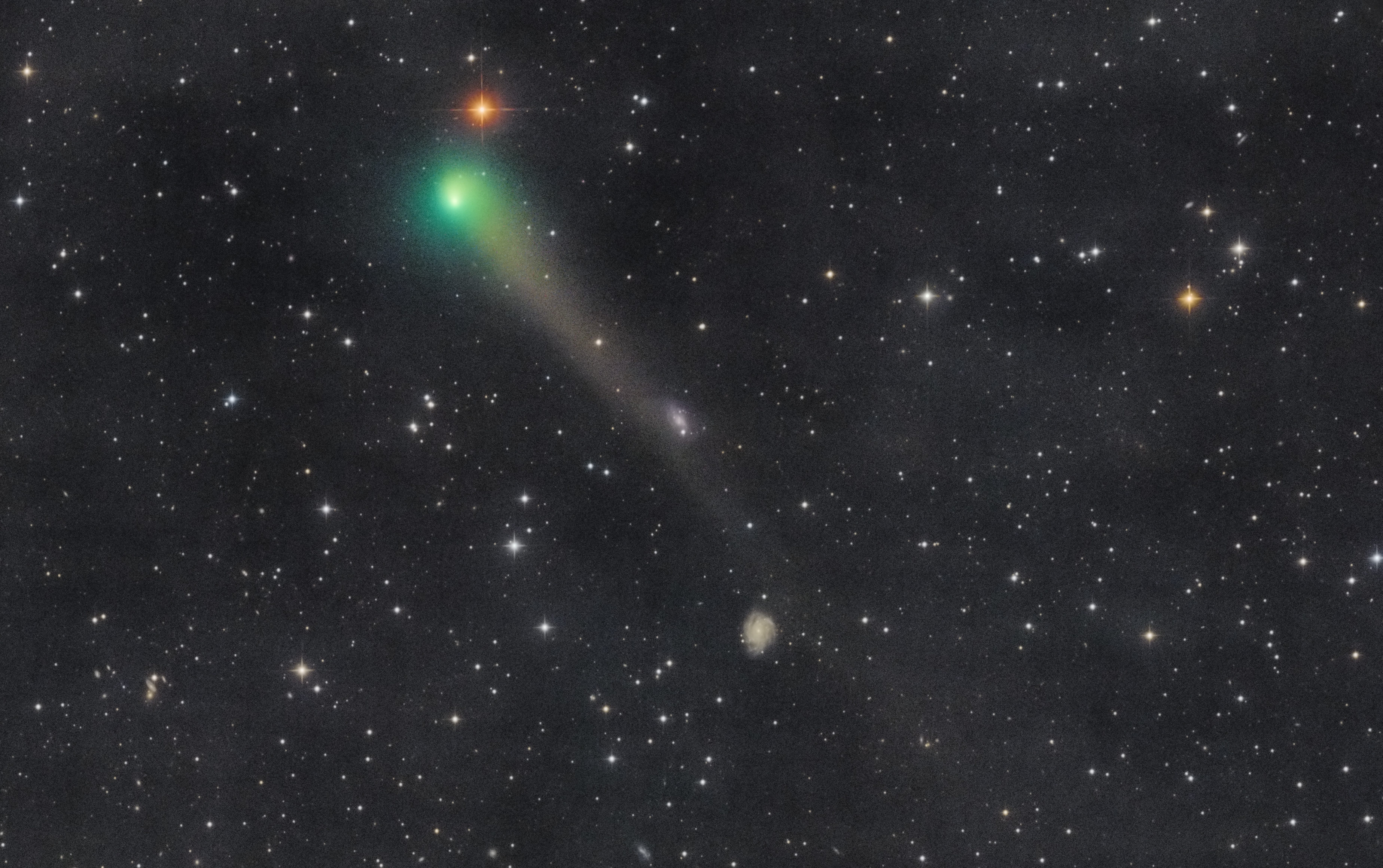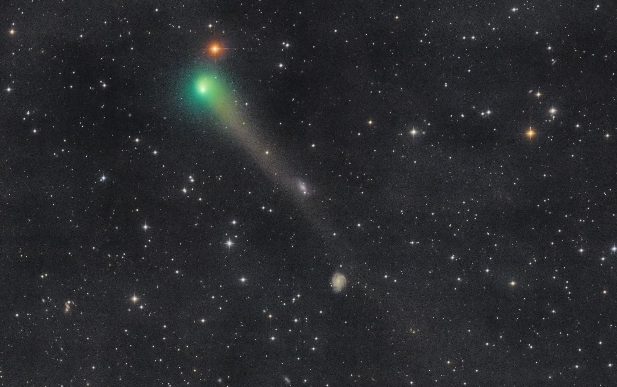 Aufnahme des Kometen C/2017 T2 PANSTARRS am 12. Juni 2020 gegen 23:19 UT. Die Belichtungszeit beträgt für den Kometen 16 x 3 Minuten, für den Hintergrund 63 x 3 Minuten. Bei den beiden Galaxien im Bereich des Kometenschweifs handelt es sich um NGC 3794 und NGC 3780.