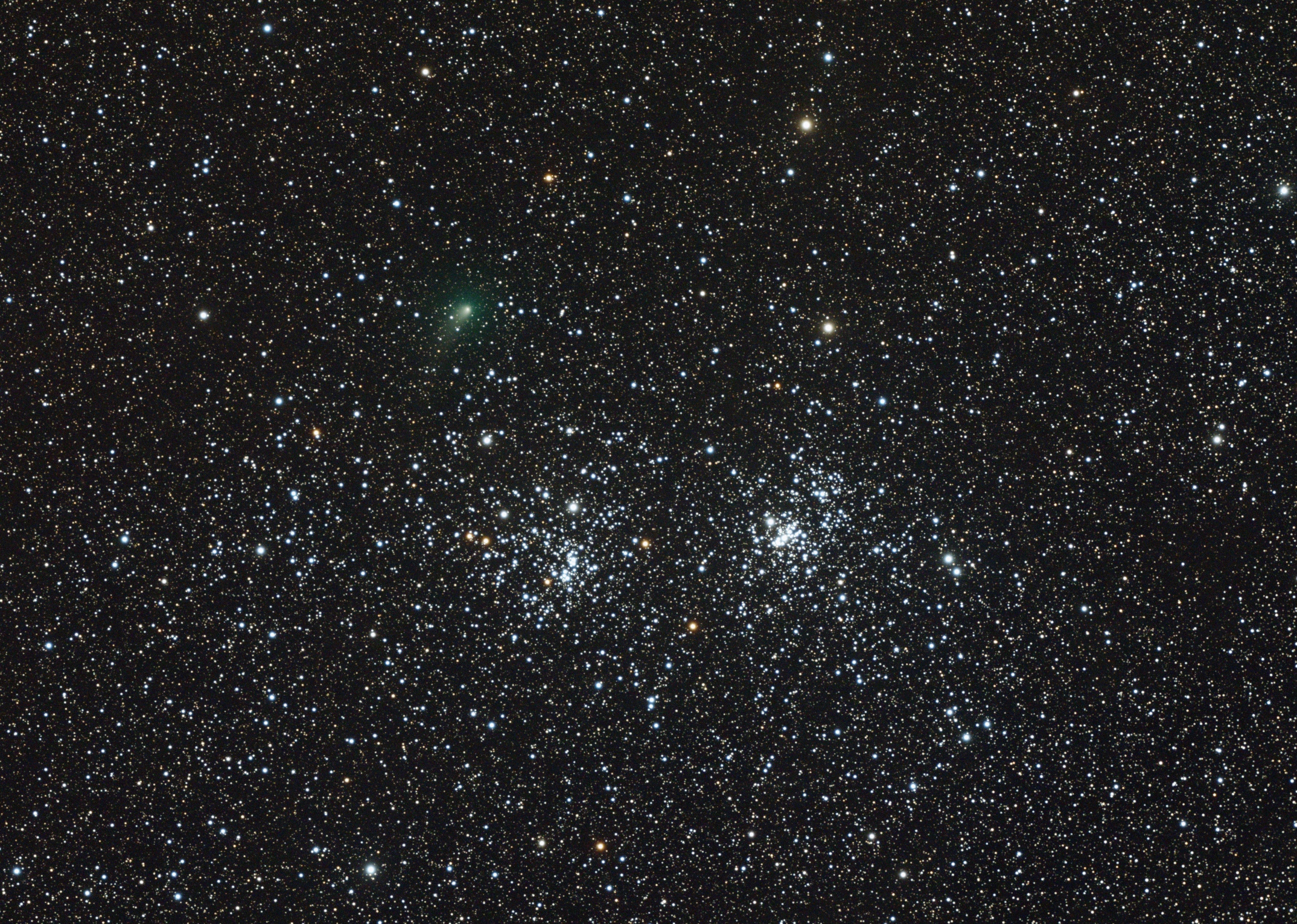 Komet Panstarrs (C/2017 T2) bei h+chi Persei am 26. Januar 2020. Aufgenommen auf La Palma. Da sich der Komet nur sehr langsam bewegt, konnte eine einzelne Belichtung von fünf Minuten Dauer verwendet werden.