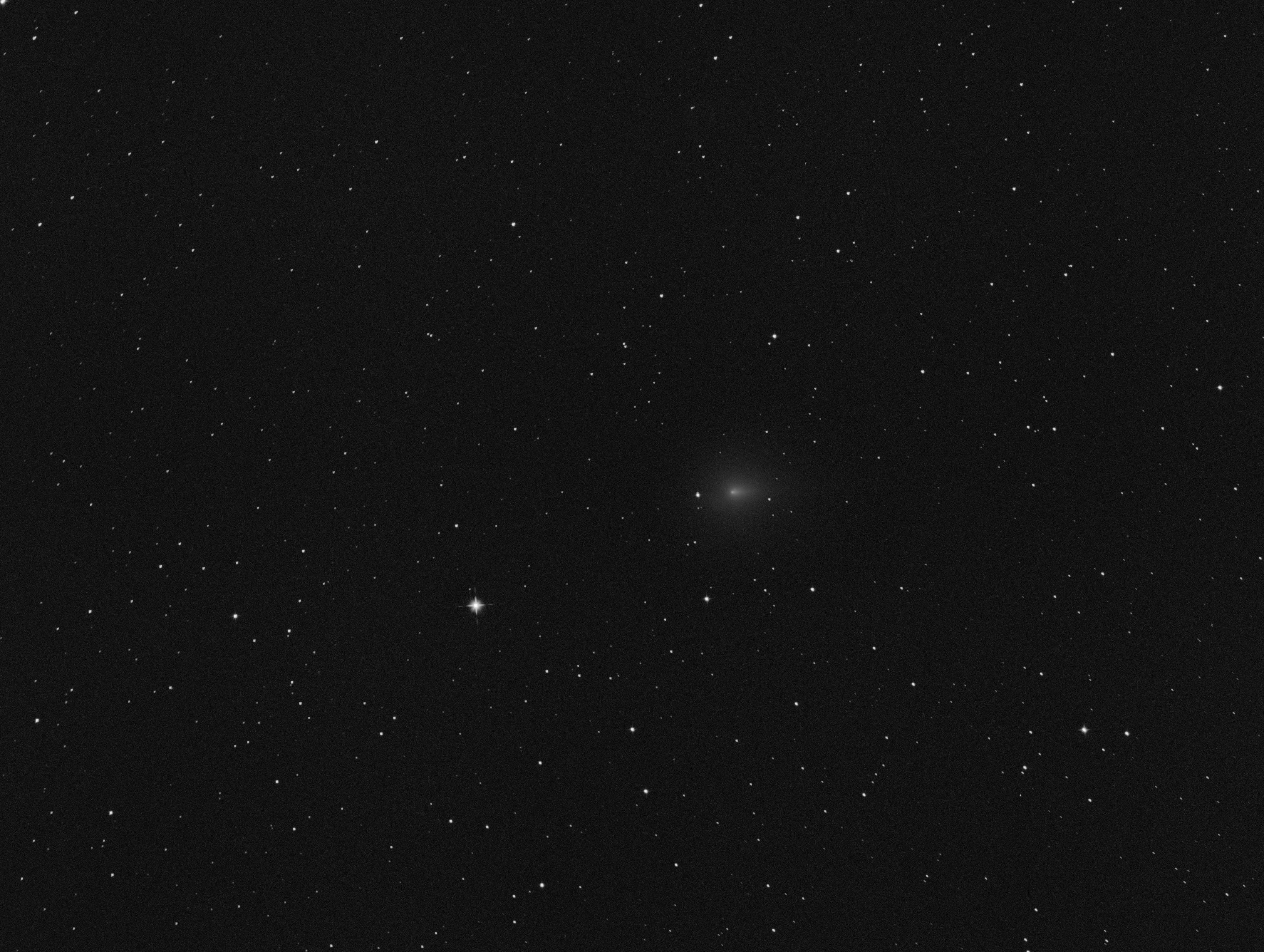 Ich wollte die klare Nacht eigentlich nutzen, um mein neues Teleskop zu justieren, so richtig weitergekommen bin ich damit nicht. Immerhin funktioniert das Guiding über OAG, und so habe ich trotz 75% Mond auf den Kometen geschwenkt und eine Serie aufgenommen. Mit Grünfilter 12 x 10s und 31 x 60s, ATIK383L+, ASA 8N mit 0.95x-Wynne-Korrektor (immerhin 11 kg) auf einer HEQ5.