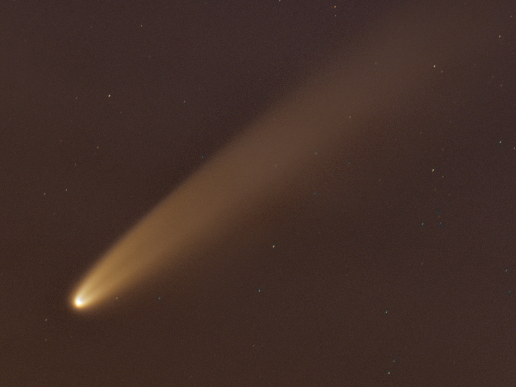 C/2020 F3 (Neowise) ist schon fast zu groß, um ihn mit einer mittleren Brennweite von etwa 1000 mm ins Bildfeld zu bekommen. Allerdings zeigt sich in der "Nahaufnahme" des Kometen das eigene Zusammenspiel der Koma und des Schweifes sehr deutlich.