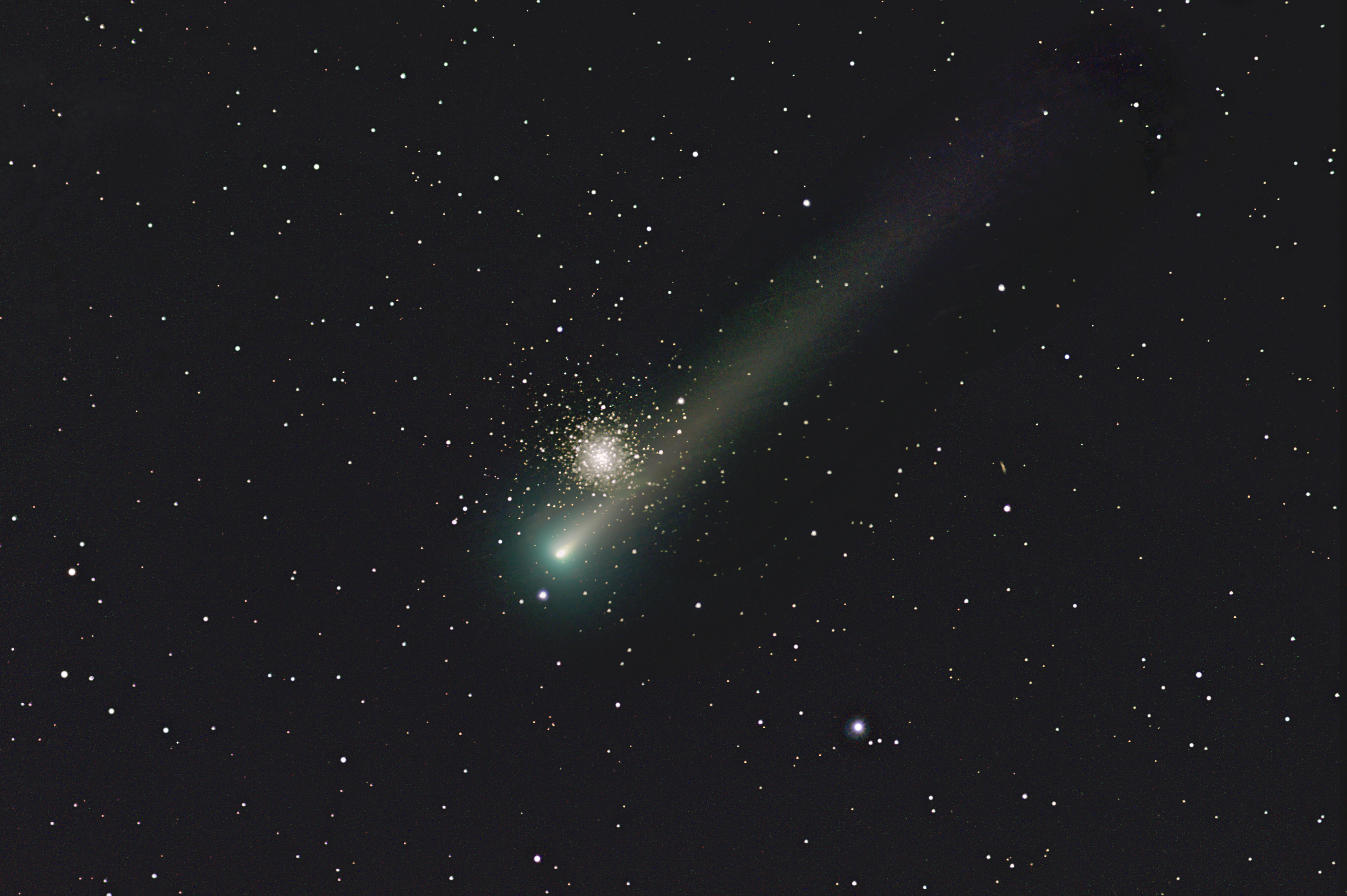 Gegen 6:00 Uhr überdeckte dann teilweise der Schweif des Kometen den Kugelsternhaufen. In einer zweiten Aufnahmeserie habe ich diese Erscheinung noch vor Einsetzen der Dämmerung aufgenommen.