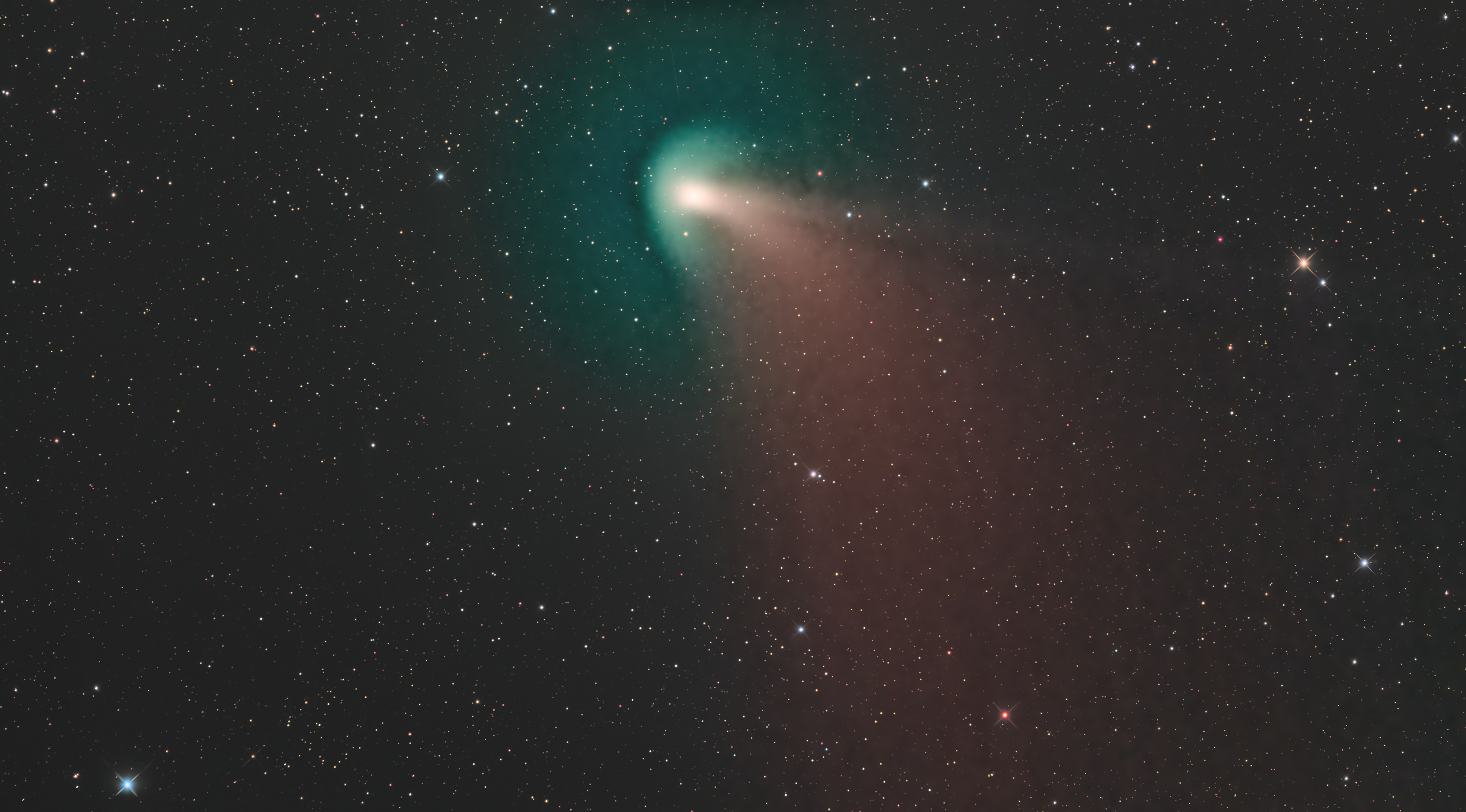 Ich habe versucht, dem Kometen ein paar Strukturen zu entlocken. Auf diesem Bild (mit Sternen) ist das in Ansätzen zu erkennen. Ich werde noch ein sternloses Bild hochladen, bei dem die Strukturen deutlicher hervortreten.