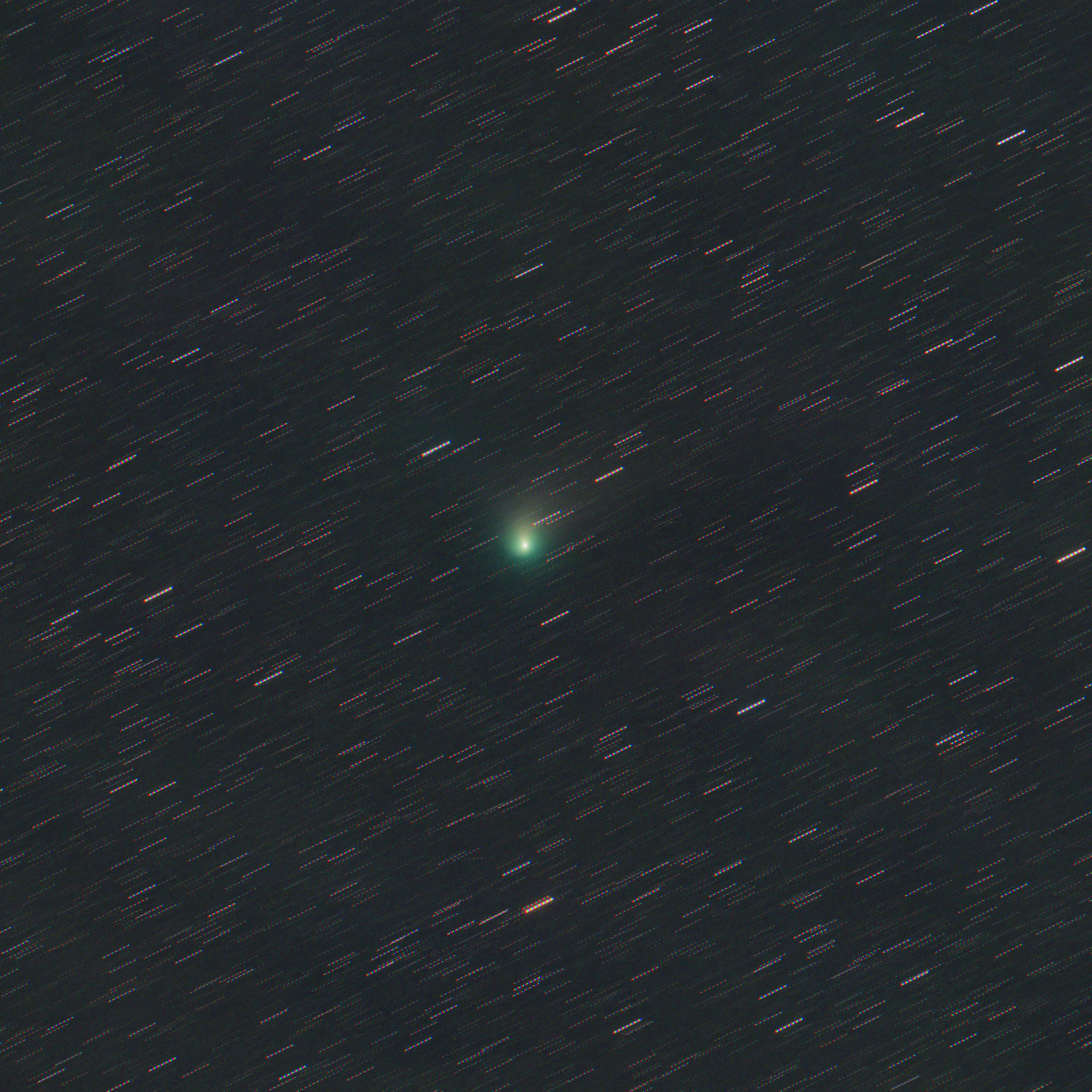 Leider hat das Wetter bei mir zu Hause bisher nicht mitgespielt, um C/2022 E3 (ZTF) mit eigener Ausrüstung zu fotografieren. Aber ich habe eine kurze Serie mit einem Remote-Teleskop machen können: T80 von iTelescope.net in Spanien. Das ist aber »nur« ein Samyang 135 mm @F2.8 mit ZWO ASI1600MM Kamera. Je sieben Aufnahmen à 60 sec in R, G, B. Gestackt mit APP auf den Kometen. Daher die hübschen farbigen Sternreihen.