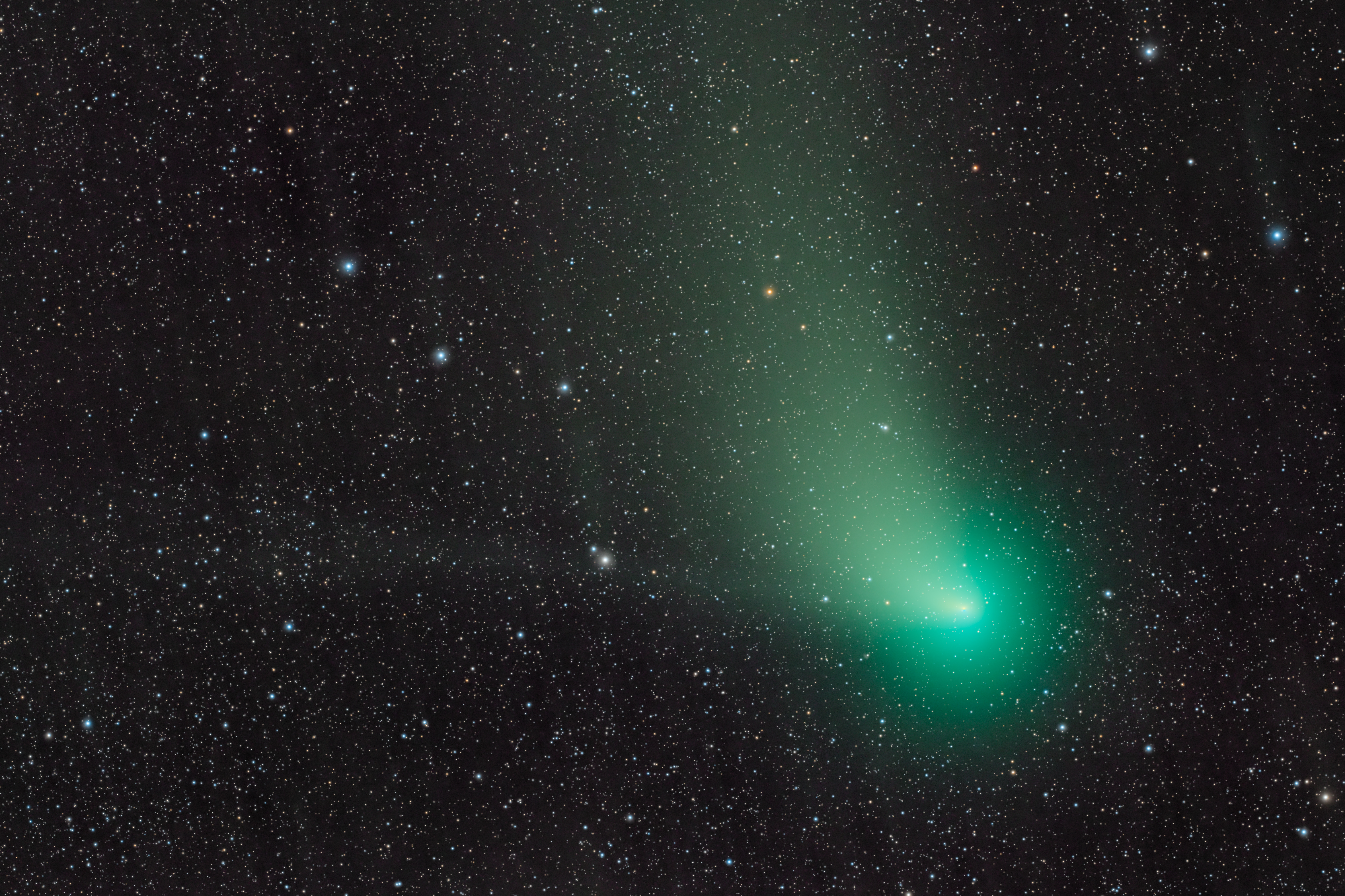 Zur Erdnähe am 1. Februar 2023 und an den Tagen danach herrschte am Standort meiner Sternwarte leider beständig Hochnebel. Am 8. Februar gelang mir in der ersten mondfreien Stunde der Nacht endlich die beigefügte Aufnahme. Es dominieren die Koma und der breite Staubschweif, während der Ionenschweif nur noch schwach sichtbar ist.
