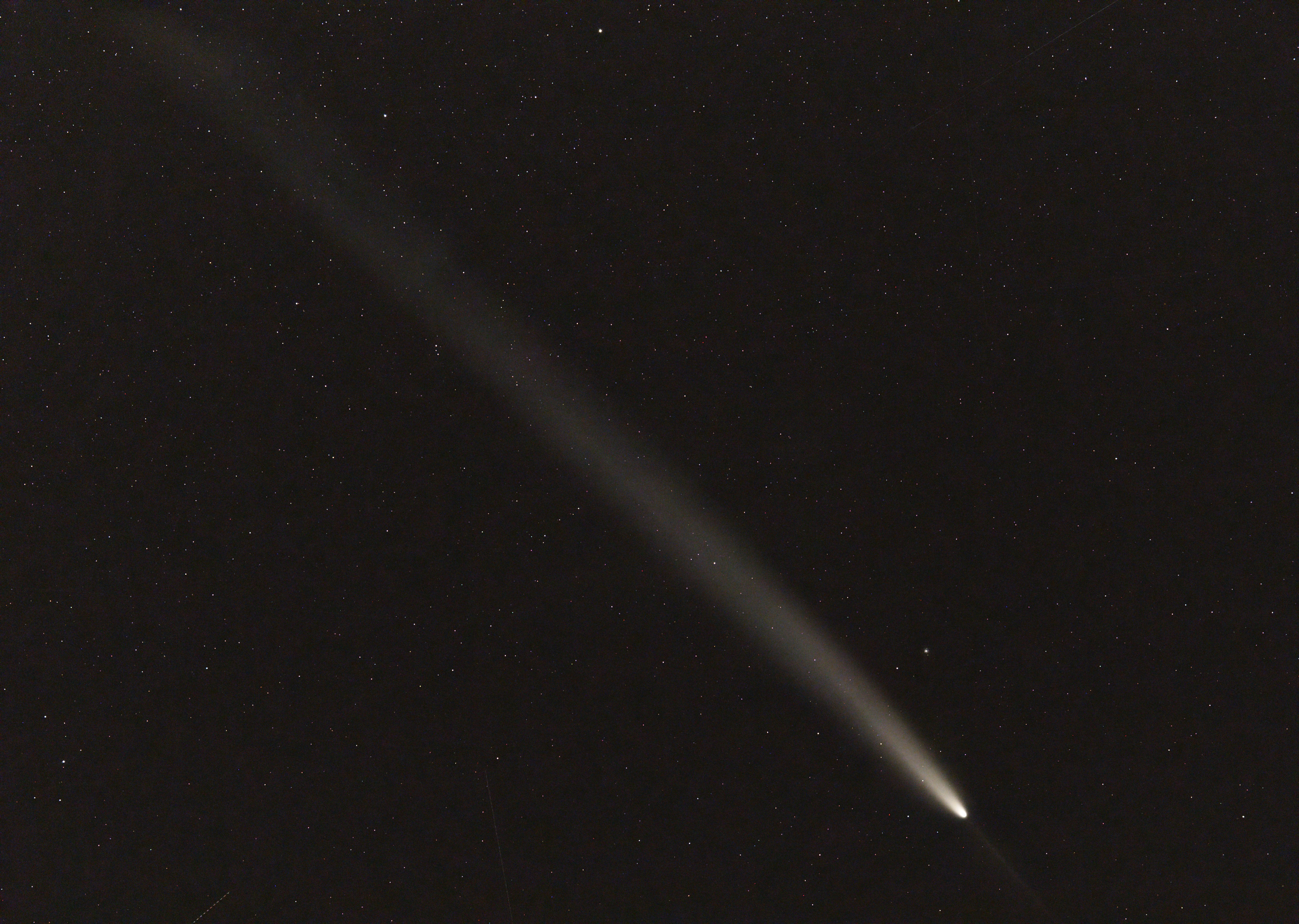 Am Abend des 15. Oktober 2024 habe ich den Kometen erstmals seit Periheldurchgang mit Schweif gesehen. Ich bin in Berlin auf den alten Flugplatz Johannisthal geradelt und habe dort eine Star Adventurer Montierung mit Samyang 135 mm f/2 Objektiv bei f/2,8 und Canon R6 Kamera aus der Satteltasche geholt. Visuell war der Komet unauffällig, Passanten, die mich ansprachen waren nicht in der Lage, ihn zu erkennen.