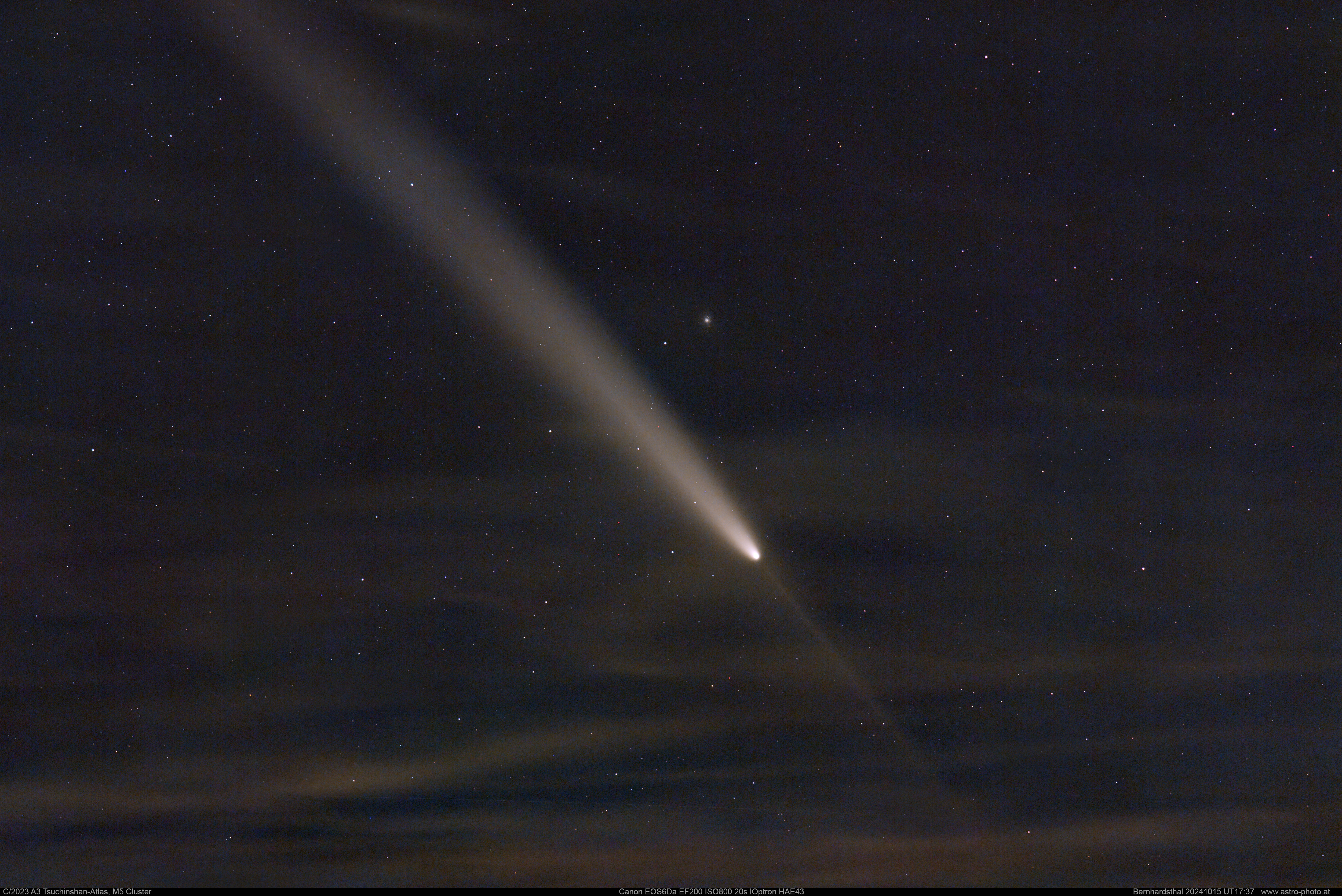 Sogar durch die Schleierwolken war der Komet samt Gegenschweif einfach zu belichten. Etwas oberhalb der Bildmitte befindet sich der Kugelsternhaufen M5.