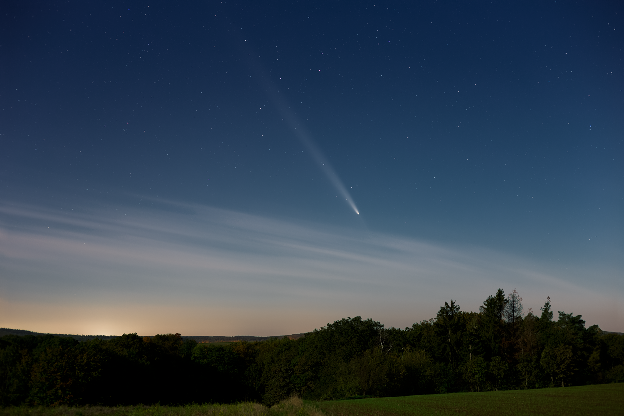 Zum ersten Mal überhaupt gelang mir gestern die Erstsichtung des Kometen C/2023 A3 (Tsuchinshan-ATLAS). Lange Zeit war der Himmel bedeckt, auch die Polarlichter am 10./11. Oktober entgingen hier so einer Beobachtung. Trotz hellem Fast-Vollmondlicht war der Komet auch mit bloßem Auge gut zu sehen. Von Südwesten näherte sich eine Zirruswolkenbank, hielt aber immer knapp Abstand zum Kometenkopf … Aufgenommen auf der Opitzhöhe bei Freital. Obwohl der Mond mit seinem Licht eigentlich stört, erhellte er den Vordergrund auch angenehm. Auch der Gegenschweif ist sehr gut ausgeprägt.
