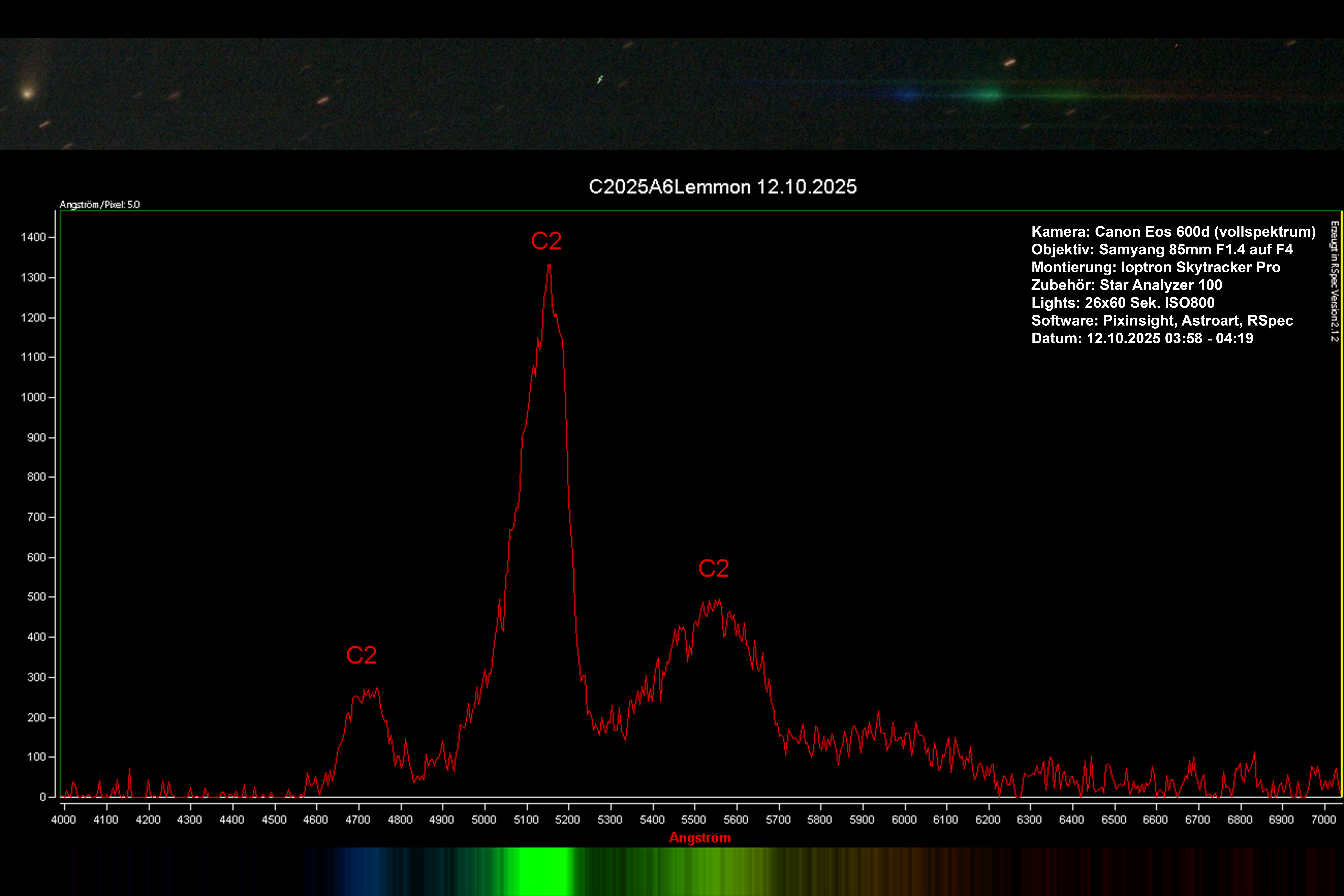 Diese Aufnahme zeigt eine Low-Res-Spektralaufnahme des Kometen C/2025 A6 Lemmon. Aufgenommen wurde das Bild mit einem Beugungsgitter (Star Analyzer 100). Sehr schön zu erkennen sind die Emissionsbänder des Dikohlenstoffs (C2), der bei der Kometenkoma für die grüne Farbe verantwortlich ist und erst durch die UV-Strahlung der Sonne entsteht.