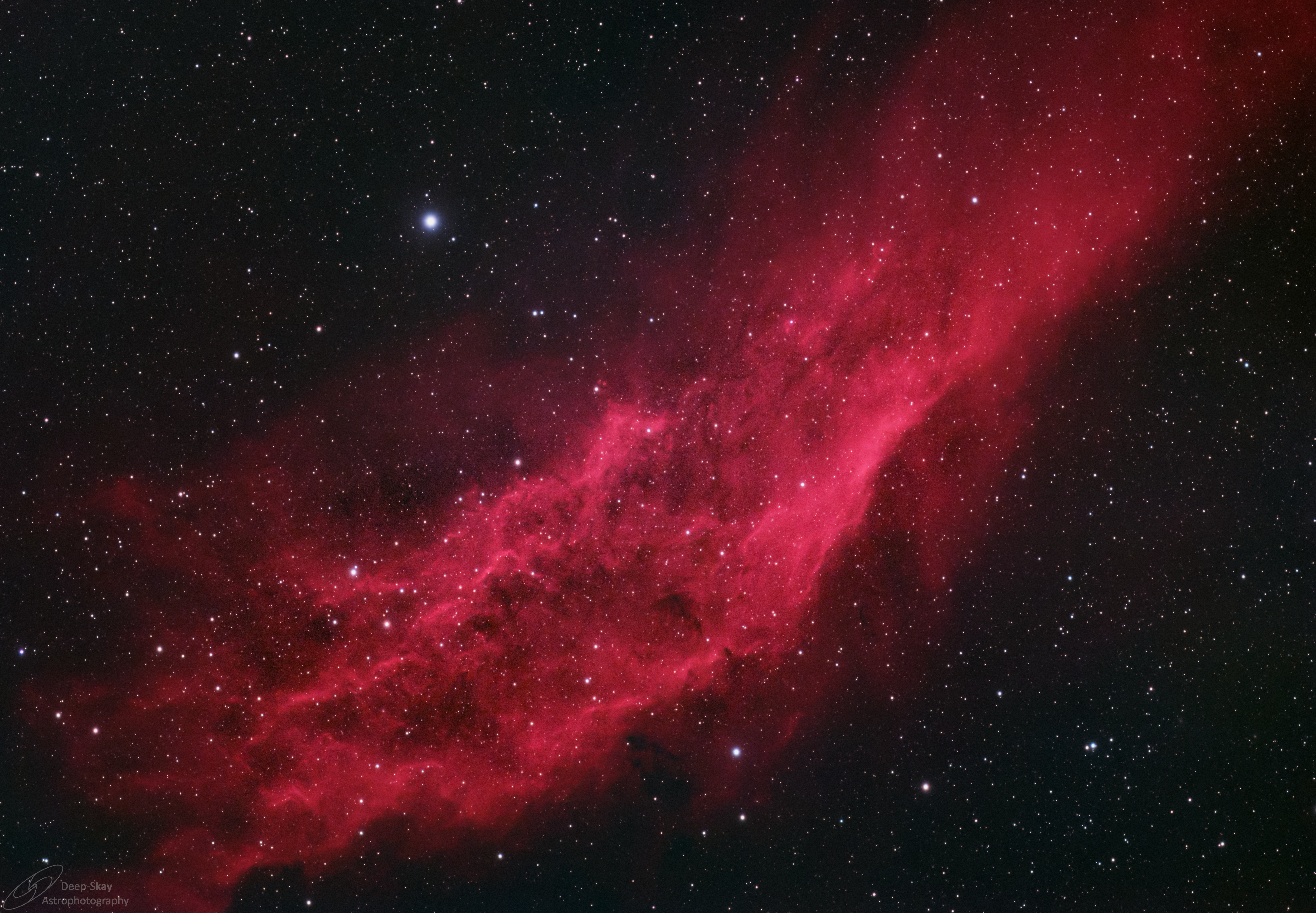 Kalifornien-Nebel im Sternbild Perseus aus vier Stunden H-Alpha- und OIII-Daten, zusammen mit 20 min RGB-Daten für die Sterne.
