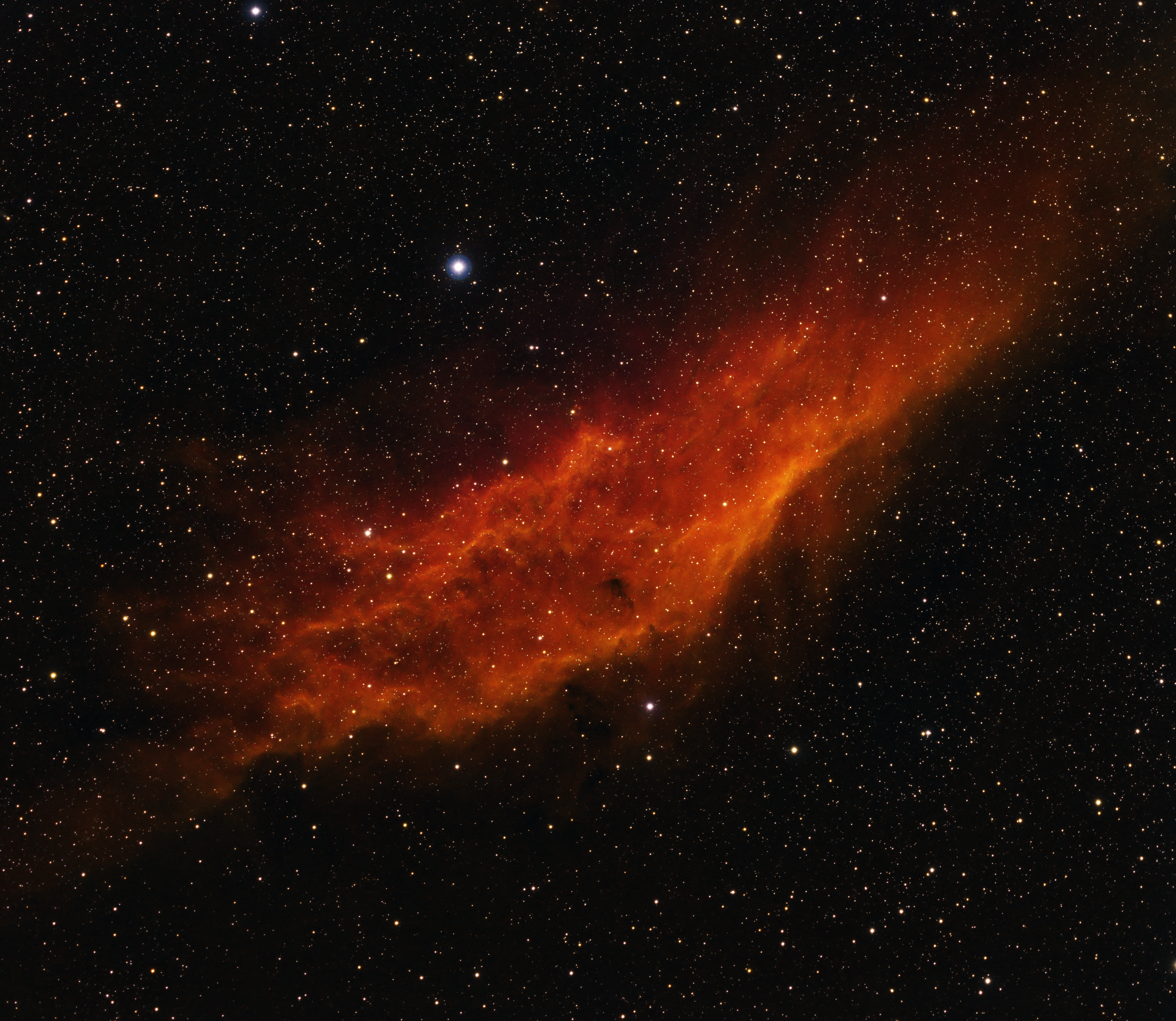 Der Californianebel ist mit 1000 Lichtjahren nicht ganz so weit entfernt, wie der große Orionnebel. Der Stern Menkib oberhalb der Mitte des Bildes ist der helle O-Stern, der den Nebel ionisiert.