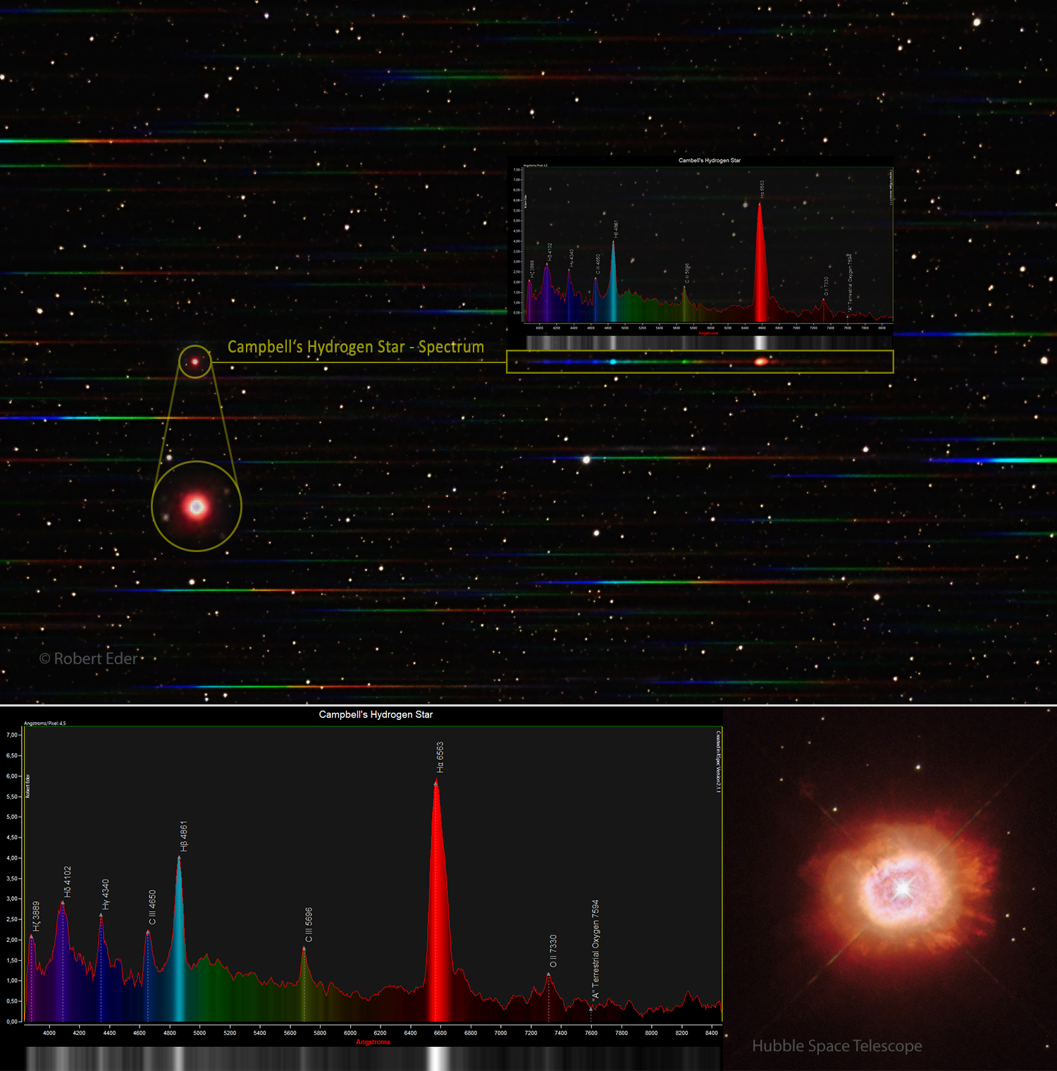 Hier mal ein Spektrum als kleine Abwechslung zu den üblichen "Pretty Pictures". Campbells Wasserstoffstern HD 184738 - BD+30 3639, das Sternzentrum des Planetarischen Nebels PK 64+5.1, ist ein sehr ungewöhnlicher Wolf-Rayet-Stern im Sternbild Schwan. Ich wollte mir einfach selbst mal seine riesige H-Alpha-Säule ansehen. Jedes Mal, wenn ich das Spektrum eines WR-Sterns im Live View von SharpCap sehe, bin ich ganz aufgeregt. Der Stern ist von rötlichen Gaswolken umgeben, die durch leuchtende Gase wie Wasserstoff und Stickstoff entstehen. Er ist als WC-Stern bekannt, eine seltene Klasse, die ihren viel massereicheren Gegenstücken ähnelt - den WR-Sternen (Wolf-Rayet). Wolf-Rayet-Sterne sind heiße Sterne, 20-mal massereicher als die Sonne, die schnell Materie wegblasen und an Masse verlieren. WC-Sterne sind etwas ganz anderes, am Ende ihres Lebens sind sie sonnenähnliche Sterne mit geringer Masse. Während diese Sterne schnell einen Großteil ihrer ursprünglichen Masse ausgestoßen haben, verliert der heiße Sternkern immer noch mit hoher Geschwindigkeit an Masse, wodurch ein heißer Wind entsteht. Es sind diese Winde, die dazu führen, dass sie Wolf-Rayet-Sternen ähneln. Allerdings können Astronomen die Zusammensetzung dieser Winde genauer untersuchen, um Sterne voneinander zu unterscheiden. WC-Sterne können anhand des Kohlenstoffs und Sauerstoffs in ihren Winden identifiziert werden, was auch in diesem Spektrum deutlich sichtbar ist. Das Bild unten rechts ist eine Aufnahme vom Hubble-Teleskop. Die Aufnahme entstand mit einem 8" Newton und dem Star Analyser 100 auf einer ASI533MC-Pro.