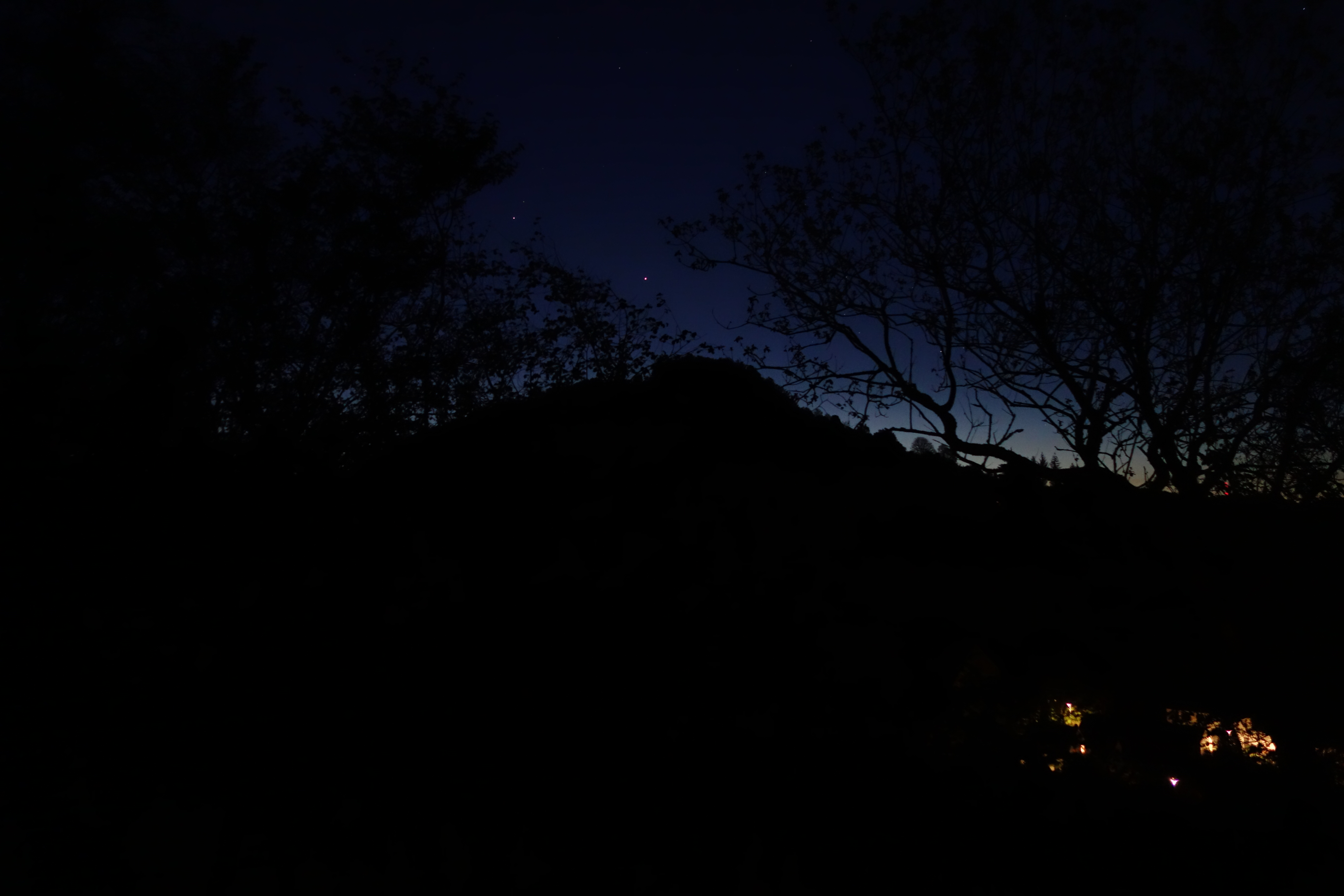 Über dem Burberg bei Schutz leuchtete Kapella ganz wunderbar, während noch ein leichter Lichtschein der untergegangenen Sonne den Horizont erhellte. Zu sehen sind auch Menkalinan und etwas schwächer Pi Aurigae. Rechts unten die Lichter von Schutz, am rechten Bildrand die roten Lichter des Sendemasts auf dem Scharteberg bei Kirchweiler.