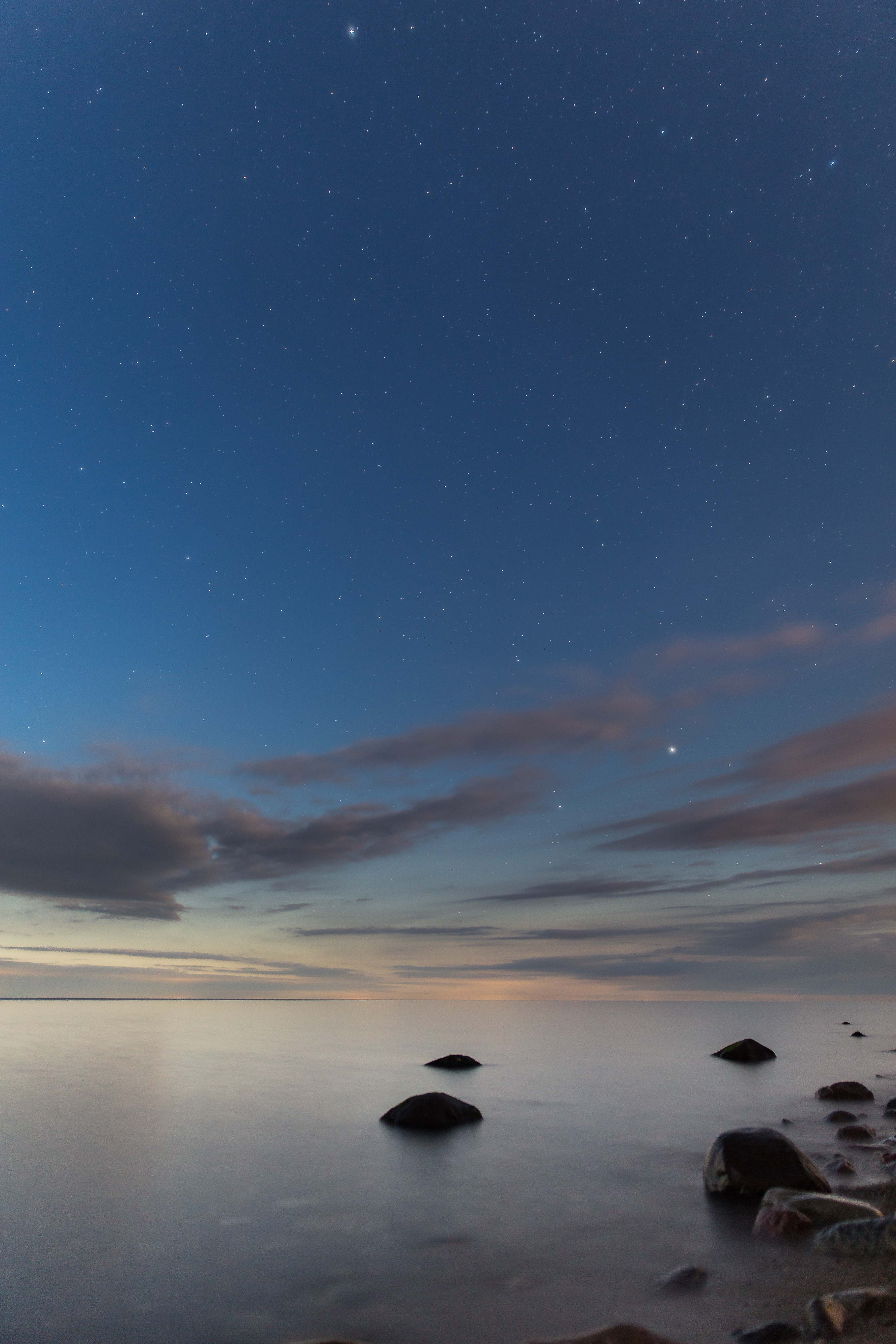 Bevor sich der Himmel komplett bewölkt, zeigt sich Capella als hellster Stern noch recht nah über dem Horizont. Zusammen mit den letzten Lichtern des Tages und dem Schein des aufgehenden Mondes bietet sich ein fast surreales Bild.