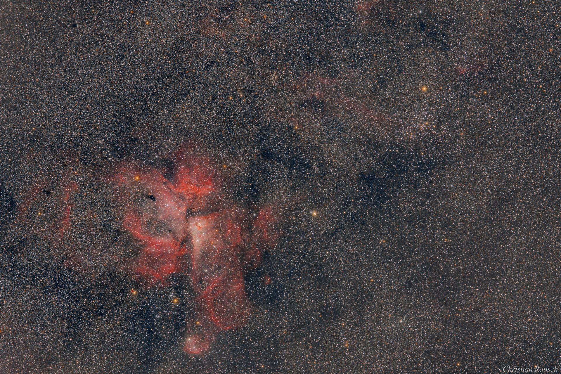 Der Carinanebel (NGC 3372), auch Eta-Carinae-Nebel, ist ein Emissionsnebel im Sternbild Kiel des Schiffs. Er hat eine scheinbare Helligkeit von +3,00 mag und einen Durchmesser von 2 Grad (4-facher Mondurchmesser!). Der Nebel ist eine der größten HII-Regionen der Galaxis und befindet sich in einer Entfernung von etwa 6500 bis 10000 Lichtjahren von der Erde. Damit erstreckt er sich über etwa 200 bis 300 Lichtjahre und liegt von uns aus gesehen mitten in der sternreichen Milchstraße. Obwohl NGC 3372 eines der hellsten Objekte am Nachthimmel ist - er ist auch deutlich heller und größer als der Orionnebel -, wurde er auf Grund seiner südlichen Lage erst 1752 von Nicolas Louis de Lacaille während seiner Reise nach Südafrika entdeckt. Das bekannteste Einzelobjekt im Carinanebel ist der veränderliche Stern η (Eta) Carinae, der Teil des offenen Haufens Trumpler 16 ist. Der unregelmäßig variable Stern (im Bild rechts des Zentrums von NGC3372) ist ein sehr massereicher, instabiler Stern. In seiner bewegten Vergangenheit erreichte er um 1730 die zweite Helligkeitsklasse, ging dann zurück auf 4 mag um 1843 seinen bisherigen Glanzpunkt mit -0,8 mag, als zeitweise zweithellster Stern des Himmels überhaupt zu erreichen. Zur Zeit liegt die Helligkeit bei 6,5 mag. NGC 3532 ist ein offener Sternhaufen und etwa 1300 Lichtjahre von der Erde entfernt. Er ist etwa 300 Millionen Jahre alt und wurde vom französischen Astronomen Nicolas Louis de Lacaille im Jahr 1752 entdeckt. NGC 3532 war das Firstlight Objekt des Weltraumteleskops Hubble.