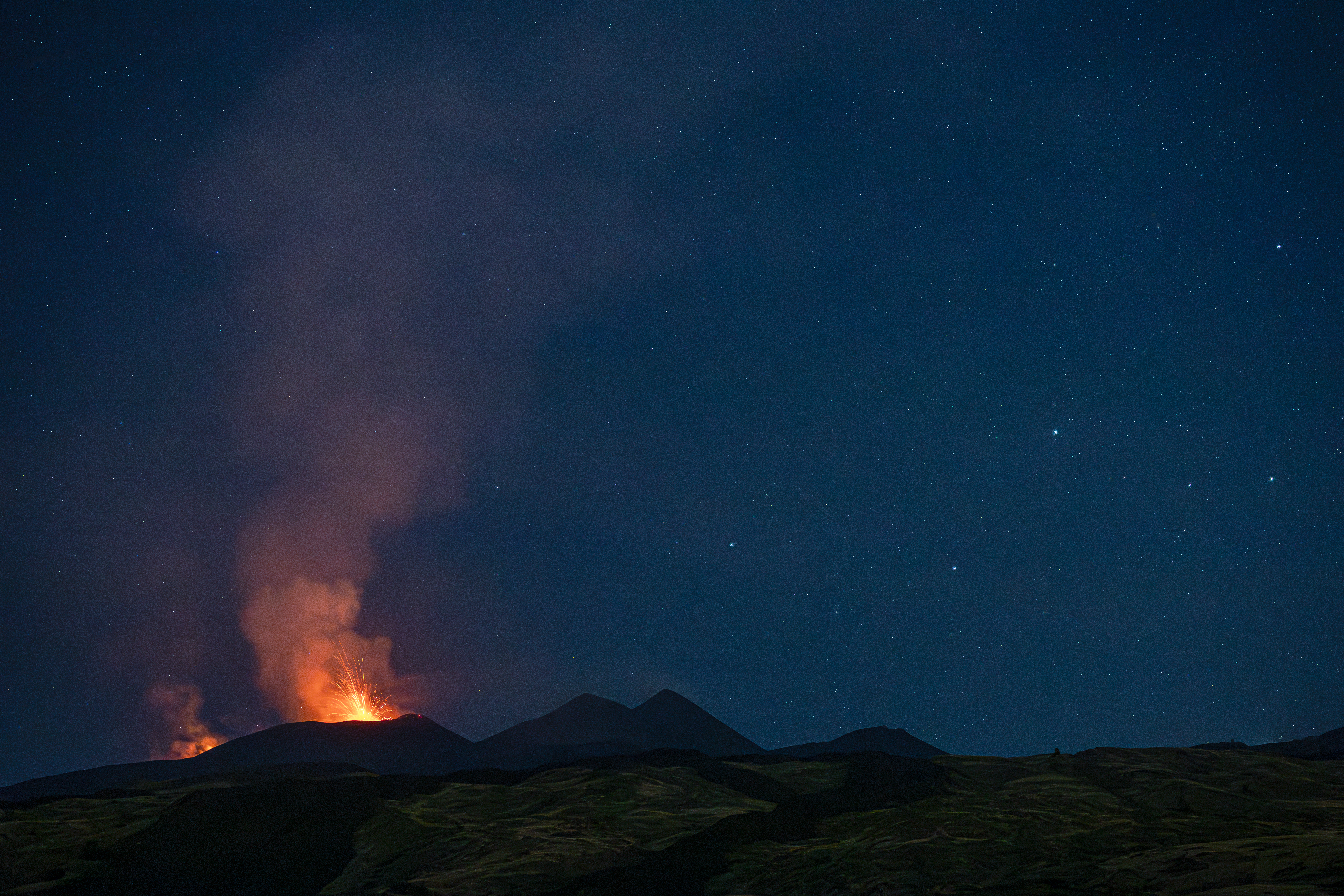 Cassiopeia, the queen, rising over erupting Etna volcano