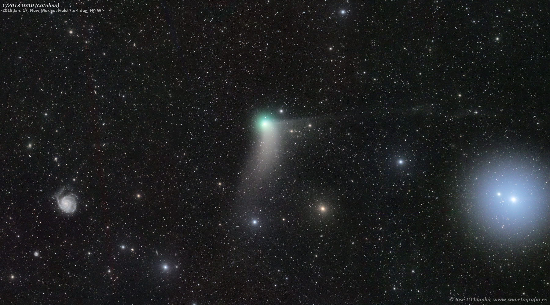 Comet C/2013 US10 (Catalina) imaged on January 17th, 2016, in conjunction with the Pinwheel-Galaxy (Messier 101) at left, and the popular pair of stars Mizar and Alcor surrounded by a bright halo induced by the refractor telescope optics. The comet stands out in center with its greenish coma from which departs a bright dust tail arched toward down, and a long ionic tail more faint toward right, going above the couple of stars.