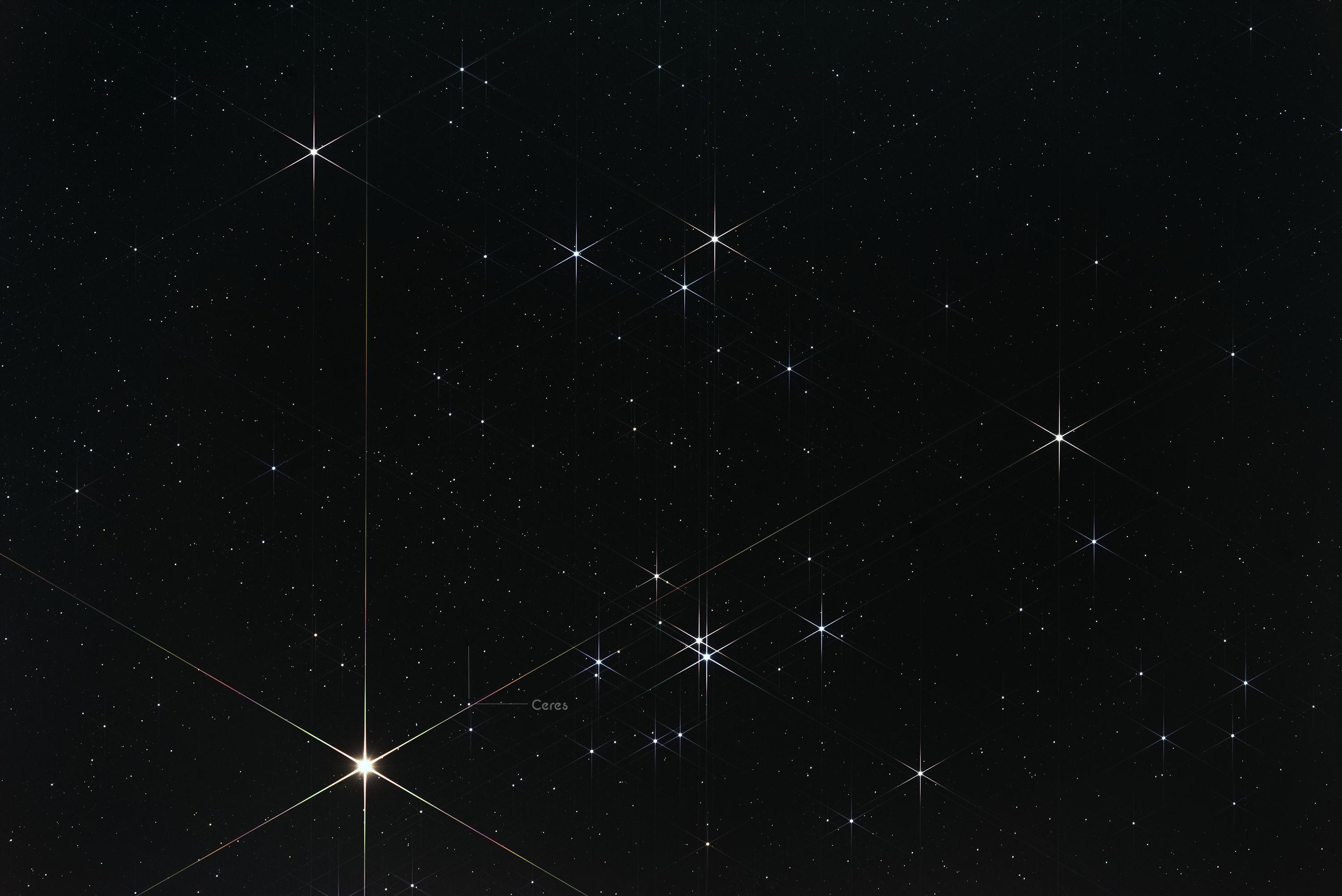 Der Kleinplanet Ceres, das größte Objekt im Asteroidengürtel, bei seiner Wanderung durch den offenen Sternhaufen der Hyaden. Drei Wochen vor seiner Opposition am 27. November, hat Ceres eine Helligkeit von 7,5 mag.