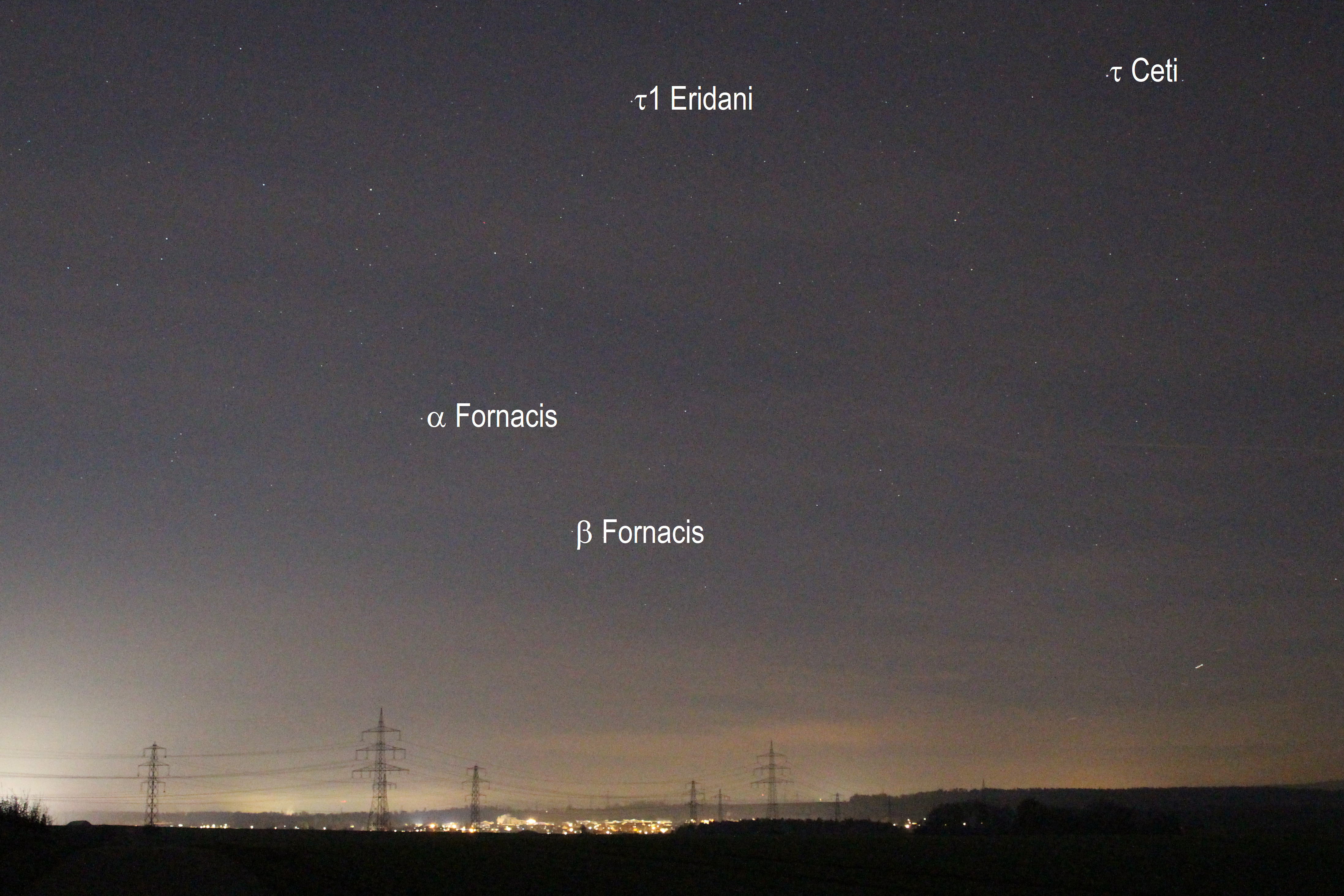 Die Aufnahme zeigt Teile des unscheinbaren Sternbilds Chemischer Ofen (Fornax), das vom großen Sternbild Eridanus umschlossen wird. Das Bild entstand westlich des Sindelfinger Ortsteils Maichingen. Im Chemischen Ofen befindet sich das Hubble Ultra Deep Field.