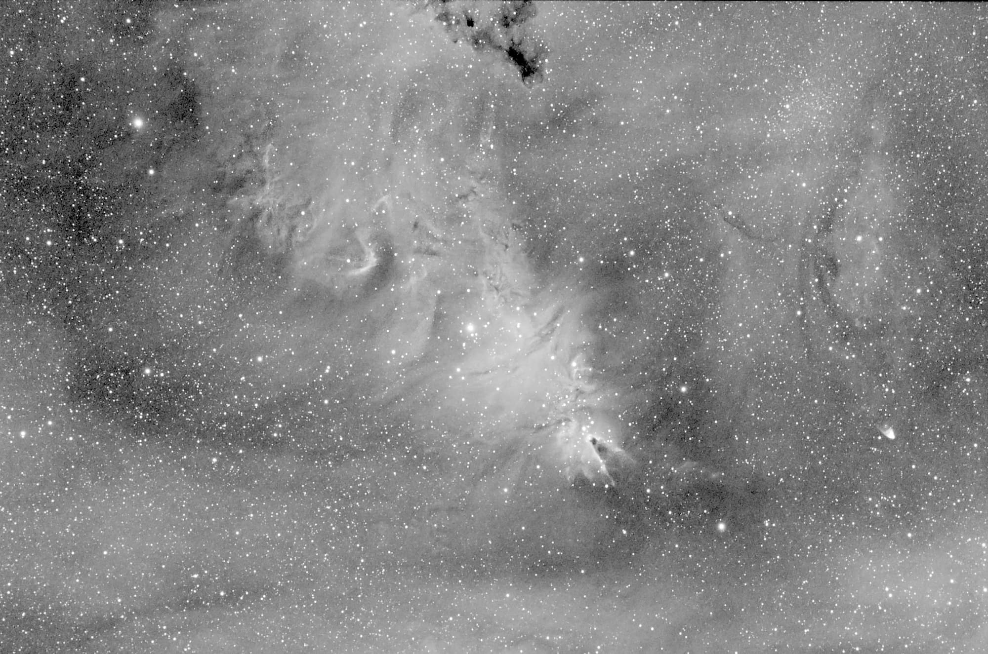 Das Gebiet um den Weihnachtsbaum-Sternhaufen und dem Konusnebel habe ich am 17.1.2012 im H-alpha-Licht aufgenommen. Insgesamt wurde hier bei mäßiger Transparenz 5 Std. belichtet.
