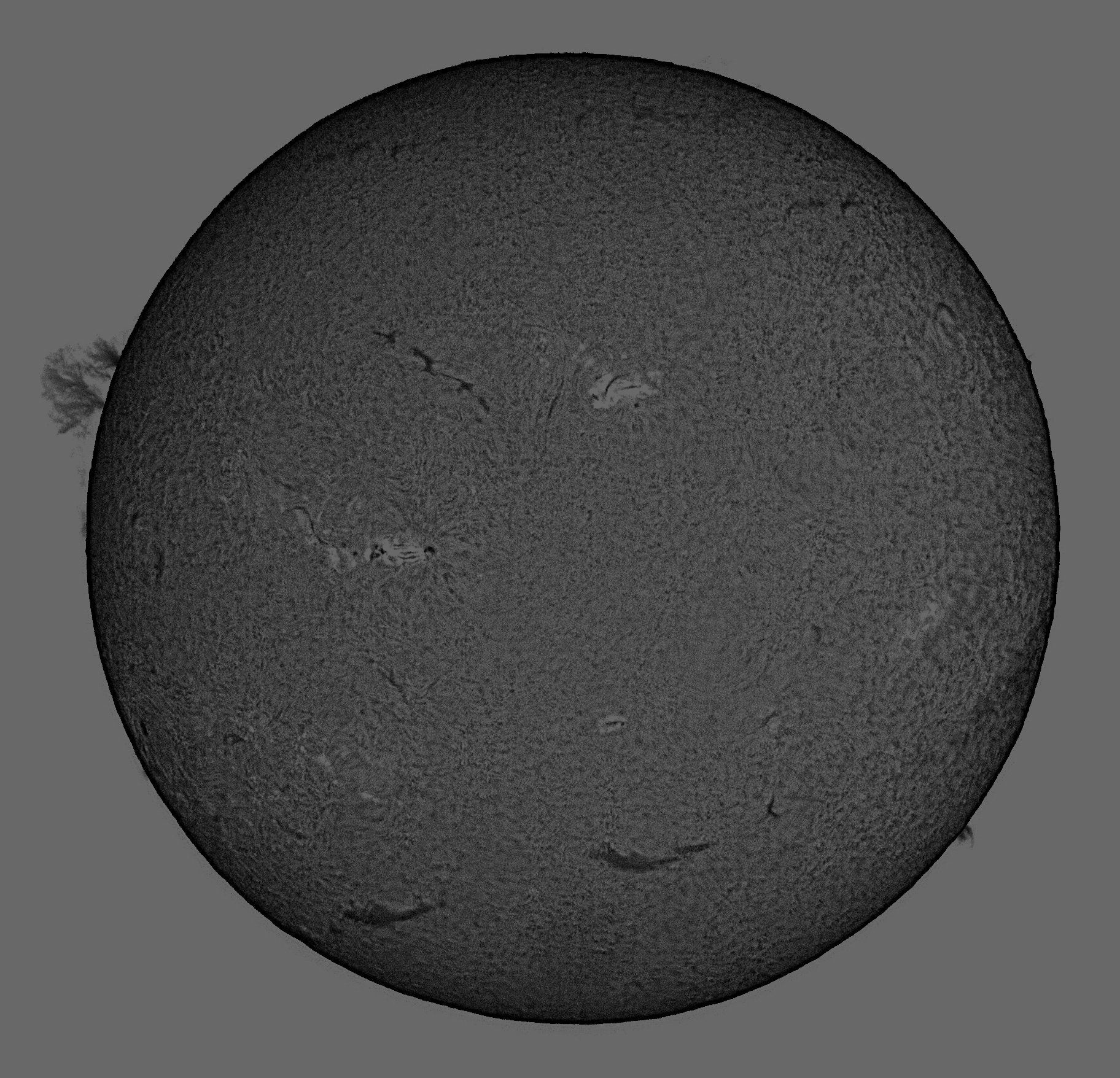 Das Foto zeigt ein invertiertes Bild der Chromosphäre mit einer imposamten Protuberanz.