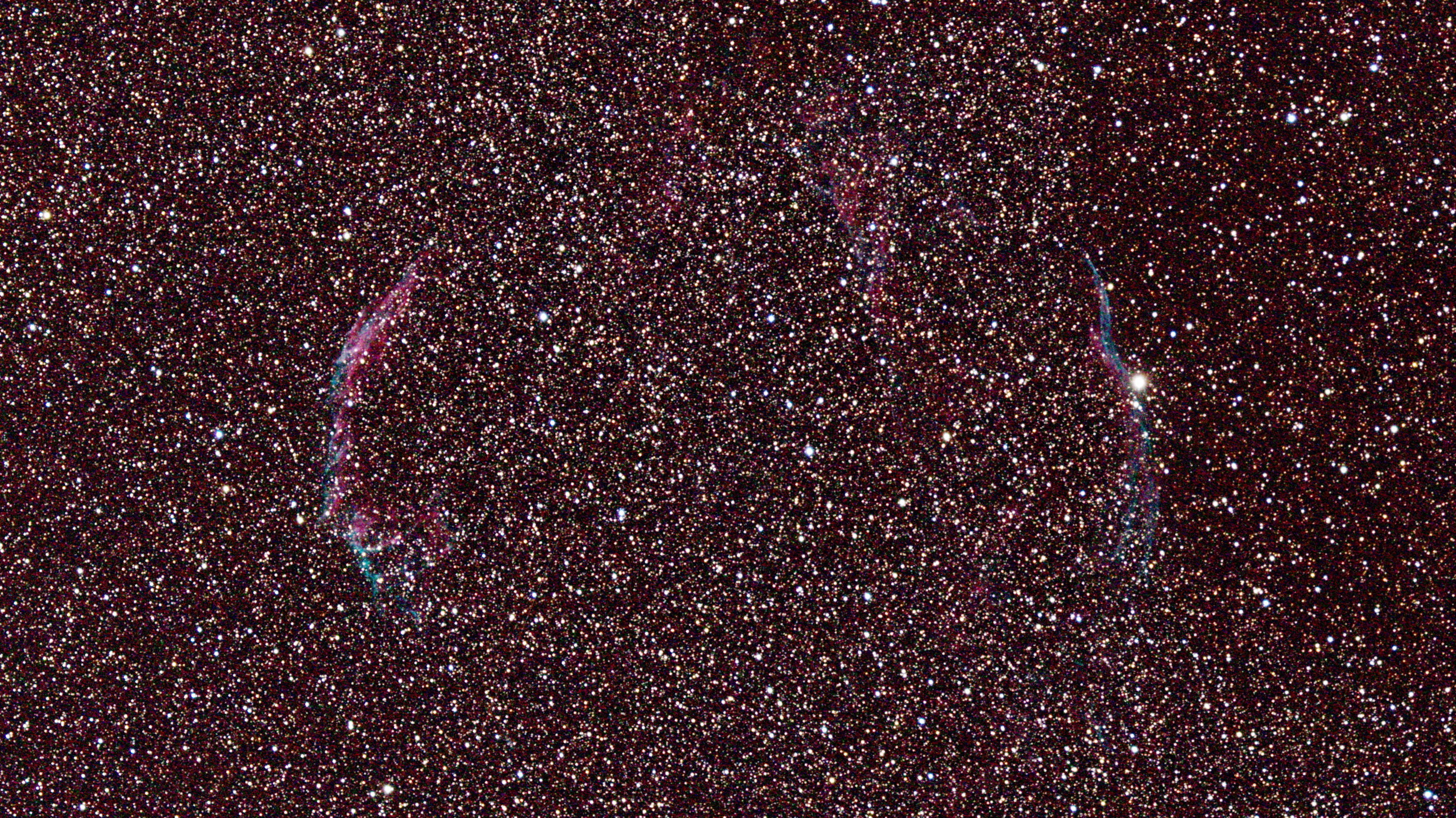 Der Cirrusnebel in einer Entfernung von 2100 Lichtjahren im Sternbild Schwan ist der Rest einer Supernova, in der vor 8000 Jahren ein Sternenleben endete. Er besteht im wesentlichen aus einem östlichen Bogen (NGC 6992 oben, NGC 6995 unten) und einem westlichen Teil (NGC 6960).