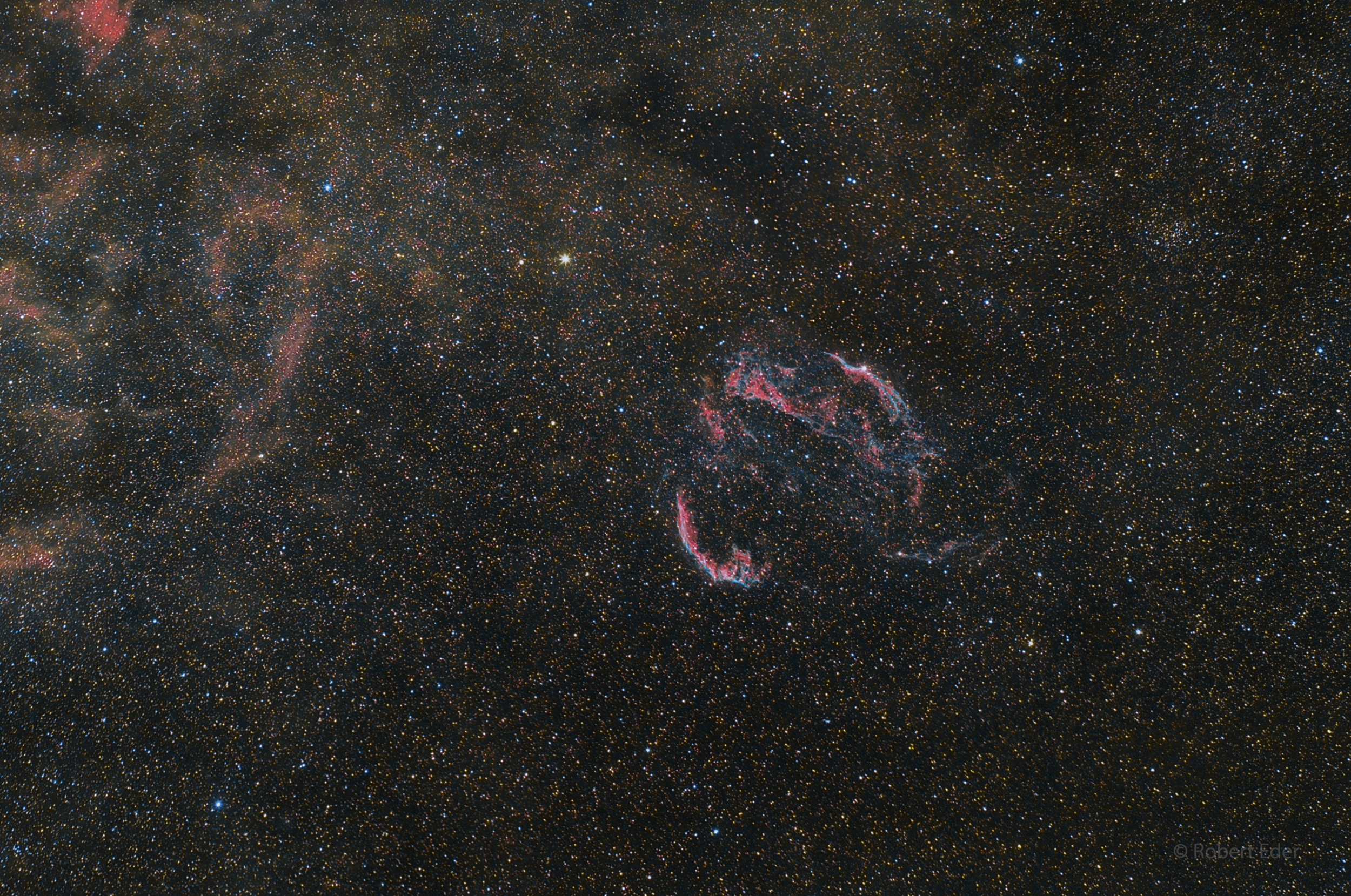 Der Zirrusnebel oder auch Schleiernebel befindet sich im Sternbild Schwan in einer Entfernung von rund 2400 Lichtjahren. Es sind Überreste einer Supernova, die vor ungefähr 8000 Jahren stattfand. Diese Wide-Field Aufnahme entstand mit einem 85-mm-Objektiv auf einem Minitrack LX3.
