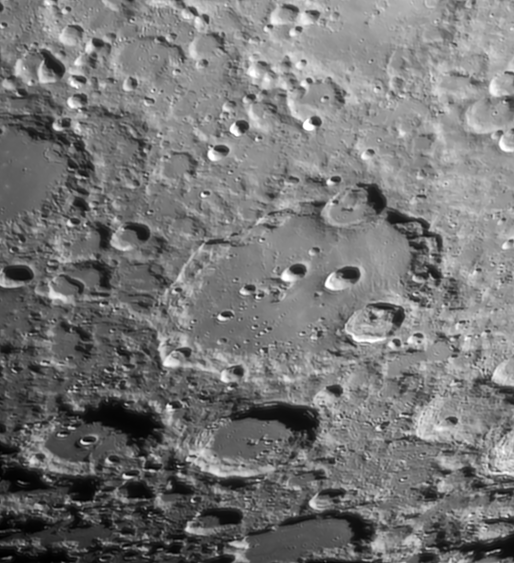 Clavius wurde mit einem 14 cm-Spiegel bei mäßigem Seeing aufgenommen. 2000 Bilder, davon 55% verwertet mit PSS.