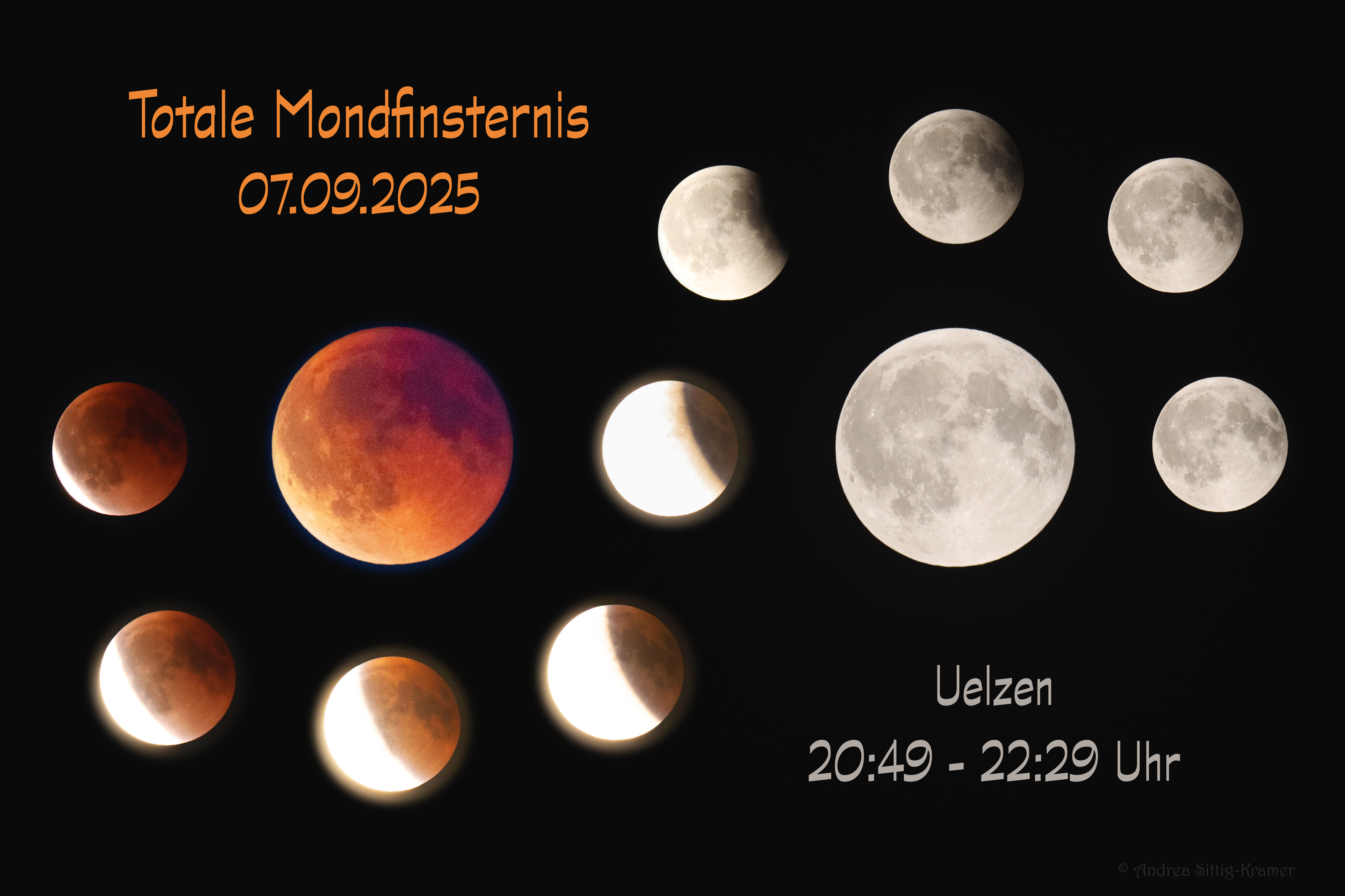 Am 7. September 2025 fand eine totale Mondfinsternis statt, von der in Deutschland aber nur die zweite Hälfte beobachtet werden konnte. In Uelzen ging der Mond um 19:49Uhr total verfinstert auf. Es dauerte etwa eine halbe Stunde, bis wir das rötliche Licht des Blutmondes durch den Dunst am Horizont sichten konnten. Ab 20:30 Uhr hatten wir bis zum Ende des himmlischen Ereignisses beste Beobachtungsbedingungen. Meine Collage zeigt die Phasen des himmlischen Schauspiels vom Ende der Totalität, dem sogenannten roten Blutmond, um 20:49 Uhr bis zum Ende der Halbschattenfinsternis um 22:29 Uhr. Die Einzelbilder sind jeweils im Abstand von zehn Minuten aufgenommen.