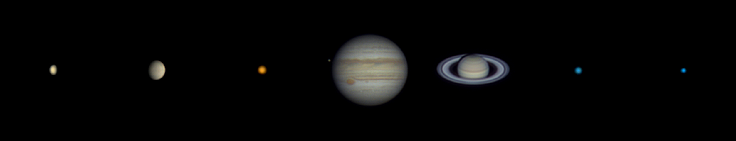 Im Lauf des Jahres 2019 habe ich alle Fotos mit der gleichen Optik und der gleichen Kamera aufgenommen. Ich habe die drei Felsplaneten zu folgenden Zeiten (MEZ) fotografiert: Merkur: 2. Dezember, 7:20 Uhr, Venus: 30. November, 16:07 Uhr, Mars: 2. Dezember, 6:55 Uhr. Die vier Gasplaneten sind zu folgenden Zeiten (MESZ) dargestellt: Jupiter: 29. Juli 2019, 22:09 Uhr, Saturn: 22. August 2019, 22:42 Uhr, Uranus: 15. September 2019, 01:49 Uhr, Neptun: 15. September 2019, 00:45 Uhr. Venus, Jupiter, Uranus und Neptun habe ich von meinem Balkon in Mannheim aus fotografiert. Bei Venus handelt es sich um eine Aufnahme nachmittags bei Tageslicht. Die Aufnahme von Saturn ist mir während meines Urlaubs in Stockach am Bodensee gelungen. Merkur und Mars habe ich vom Strandbad Mannheim aus fotografiert bei Tagesanbruch. Im Jahr 2020 möchte ich die Collage nochmals aufwerten mit einer möglichst detaillierten Aufnahme von Mars während seiner maximalen Annäherung zur Erde.