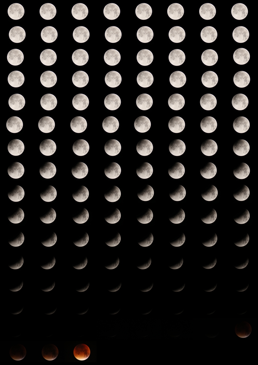 Ab 2:10 MESZ fotografierte ich mit einer Canon EOS 100D an einem Meade 12,7 cm Achromatischer Refraktor mit 1140 mm Brennweite den Mond im Abstand von jeweils einer Minute. Die Aufnahmen bis 4:08 MESZ wurden mit 1/250 s Belichtungszeit bei ISO 200 aufgenommen. Danach steigerte ich den ISO-Wert und anschließend noch die Belichtungszeit. Dadurch kam erst der rötliche Anblick des Mondes zum Vorschein. Das letzte Bild wurde um 4:15 MESZ 1 s bei ISO 3200 belichtet.
