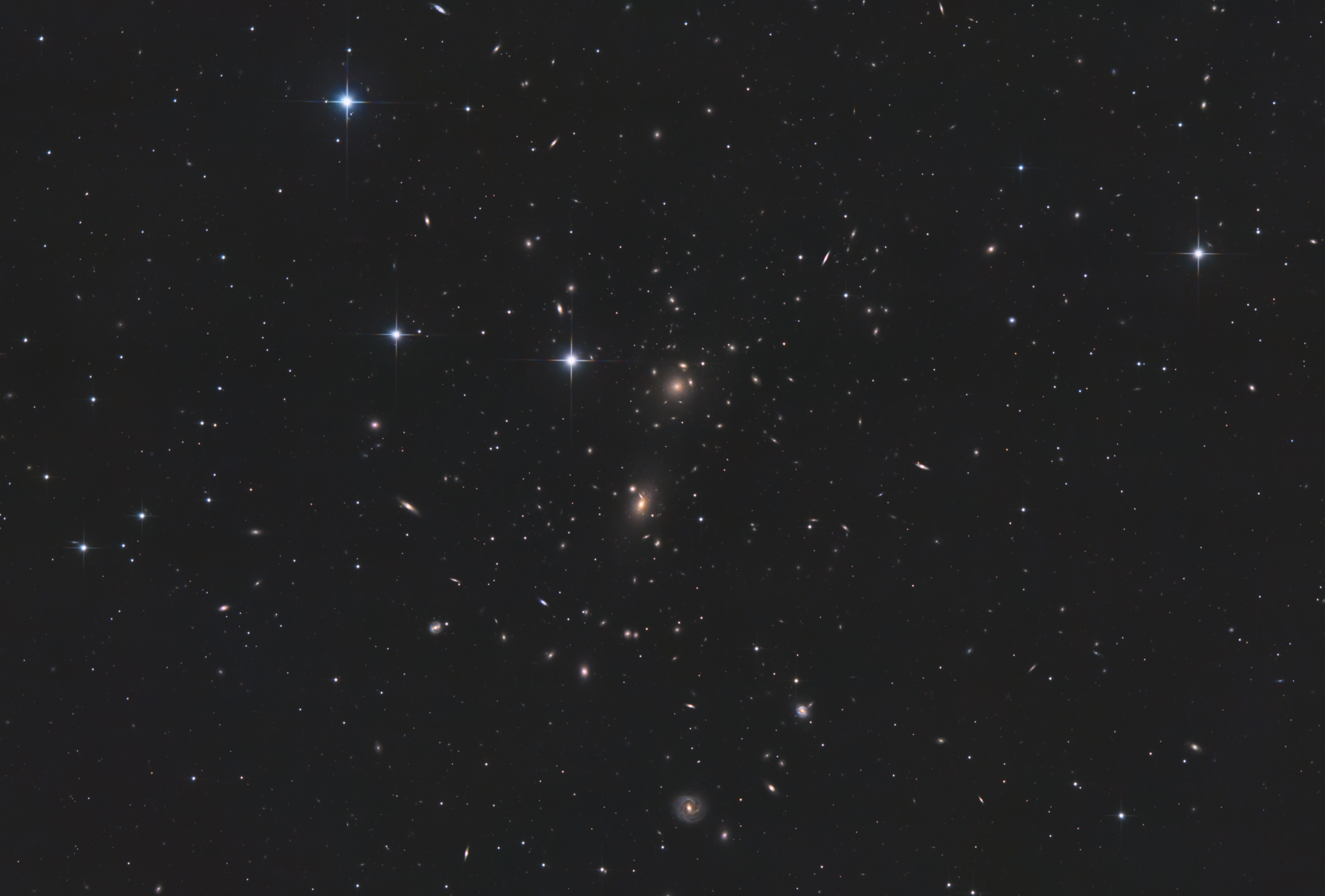 Knapp neben dem galaktischen Nordpol befindet sich weitab vom störenden Staub der Milchstraße im Sternbild Haar der Berenike der Galaxienhaufen Abell 1656 mit mehr als 1000 Galaxien in einer Entfernung von knapp 300 Millionen Lichtjahren.