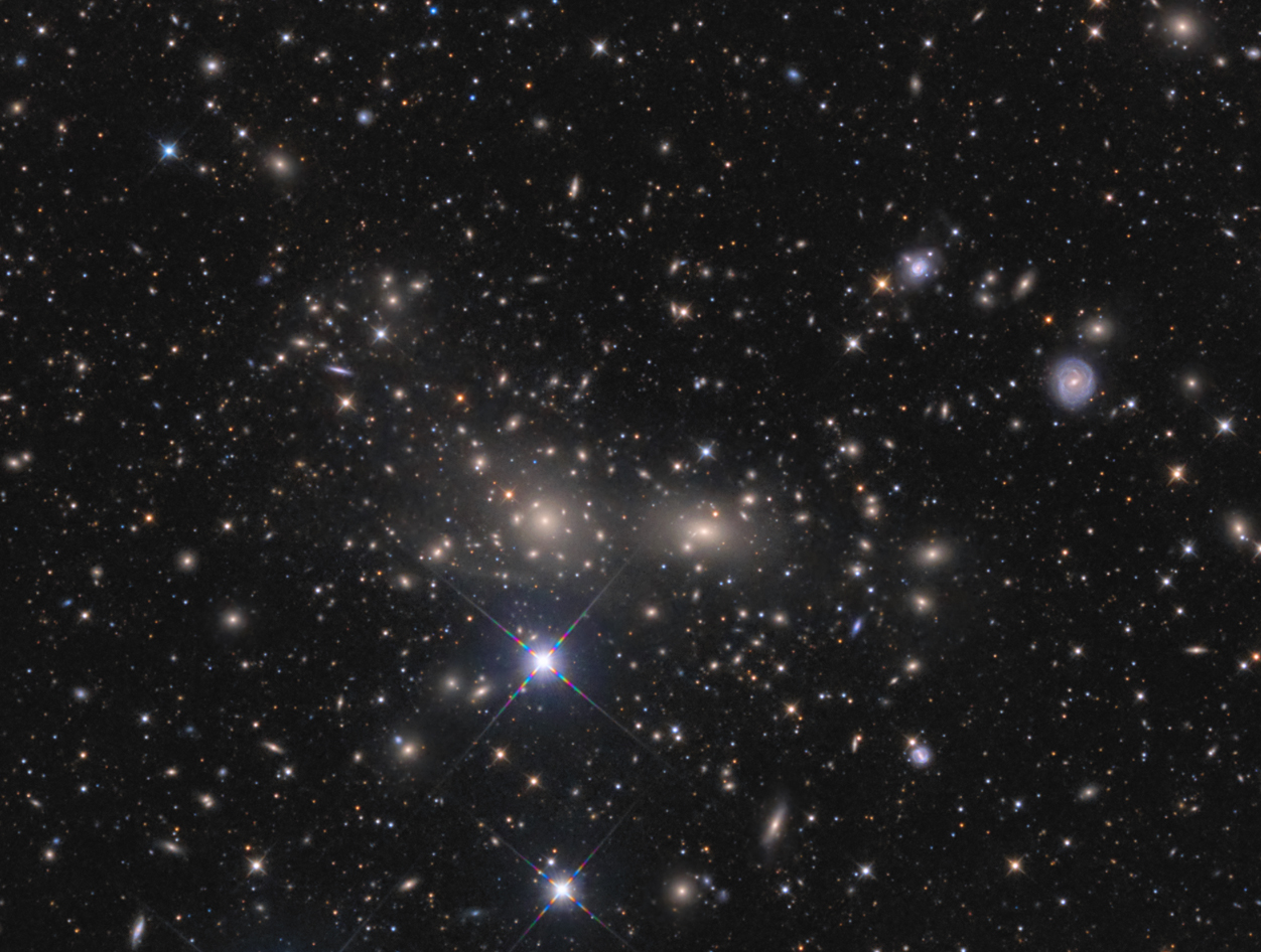 Der Coma-Galaxienhaufen, oder Abell1656, passt sehr schön ins 2,5 x 1,8° Feld des Epsi mit der ASI1600 (eigentlich ist er noch größer). Im Zentrum steht das dominante Paar NGC 4889 und NGC 4874, zwei elliptische Riesengalaxien vom Typ cD, und der Kern ist von einem feinen nebel oder Gas eingehüllt wie man auf der Aufnahme sieht. Das Feld ist voll mit Galaxien aller Art, aber hauptsächlich ellipische - deshalb wird vermutet es handelt sich um einen alten Haufen, wo bereits viele Verschmelzungen stattgefunden haben. Volles Feld & beschriftete Version: https://www.astrobin.com/d81czz/