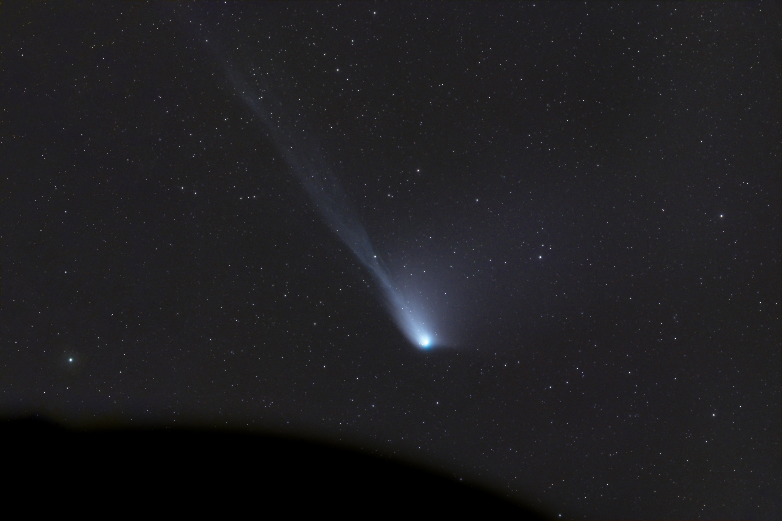 After becoming observable only from the southern hemisphere, comet 12P/Pons-Brooks shows a formidable aspect as it sets over the mountainous horizon between the Central Highlands and the Namibian Desert. Its coma shines at magnitude 4.5, and from it emanates the straight ion tail that rises several degrees in the sky, revealing undulating structures of plasma carried by the solar wind. On the other hand, the dust tail fans out to the right, scattering dust particles across the comet's orbital plane.