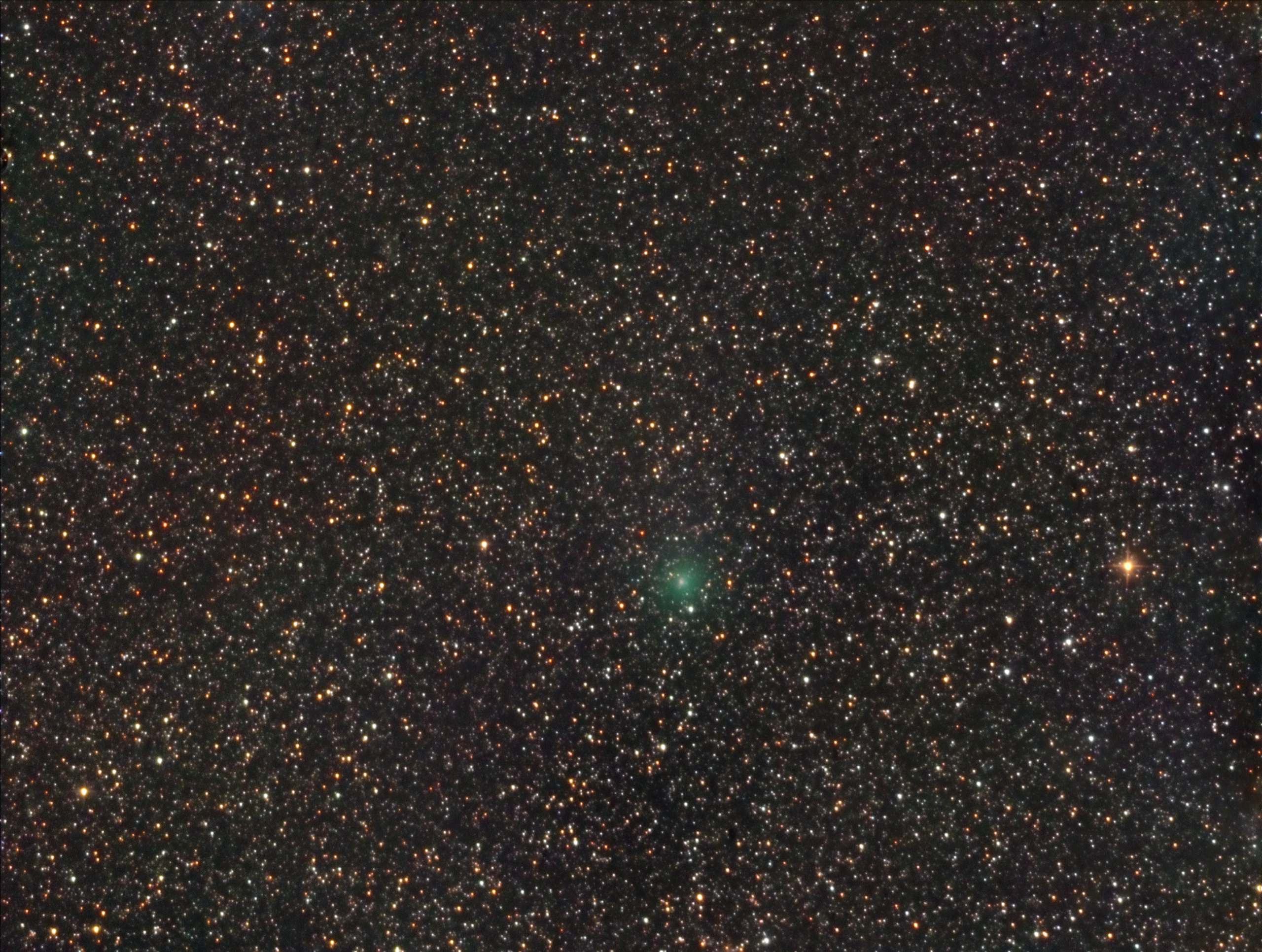 Comet 12P/Pons-Brooks imaged on January 6, 2024, over one of the densest Milky Way regions within constellation Cygnus. With no trace of activity outbursts it experienced weeks ago, the comet now displays a coma of intense green color and a faint tail, masked by the myriad of stars.